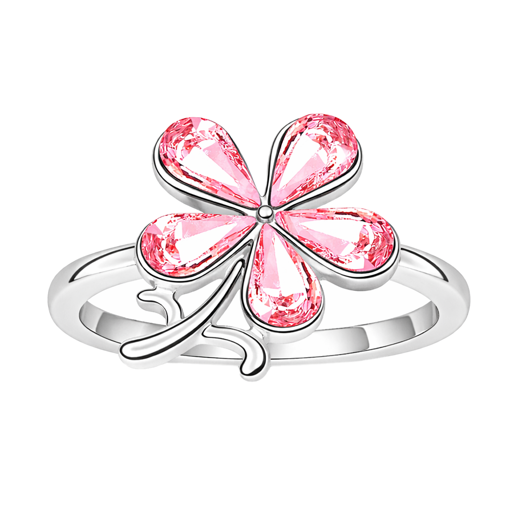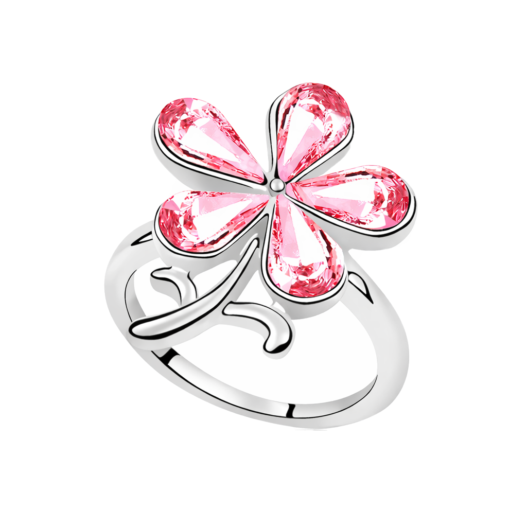 Precioso anillo en baño de oro blanco de 18 quilates, diseño de flor con cristales rosas corte pera.