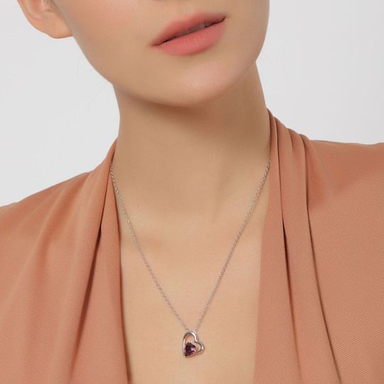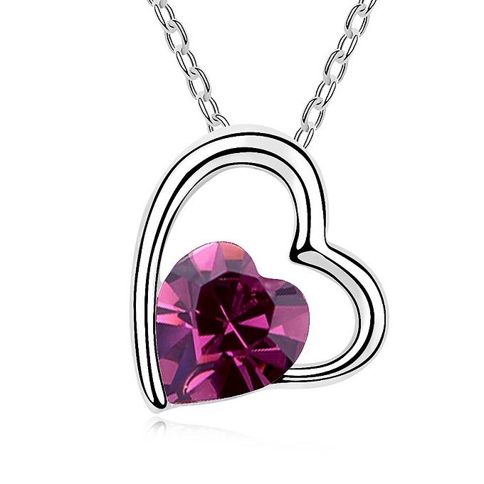 Precioso Dije, en baño de oro blanco de 18 quilates, con diseño de corazón, y detalle de cristales en color purpura en forma de corazón. Fabricado en una estructura de aleación de platino con rodio sin níquel. 1. joyería Hipoalergénica. 2. Incluye cajita de joyería. 3. Garantía de 30 días por defectos de fabrica.