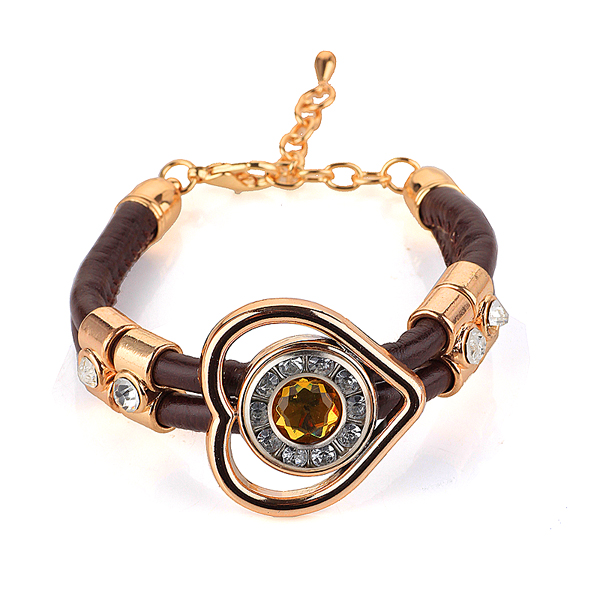 Pulsera en baño de oro amarillo de 18 quilates, con correa doble de vinipiel color café, diseño de corazón, con cristal ámbar corte brillante e incrustaciones de cristales blancos.