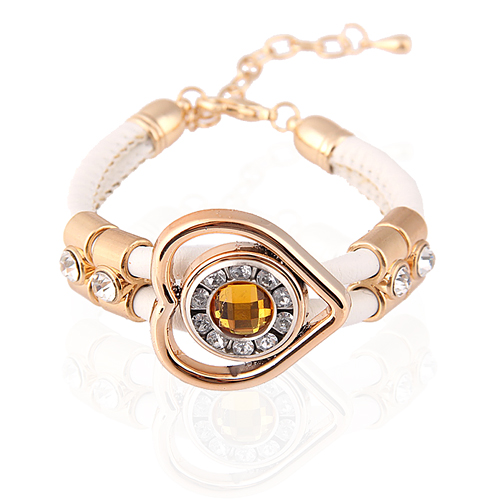 Pulsera en baño de oro amarillo de 18 quilates, con correa doble de vinipiel color camel, diseño de corazón, con cristal ámbar corte brillante e incrustaciones de cristales blancos.
