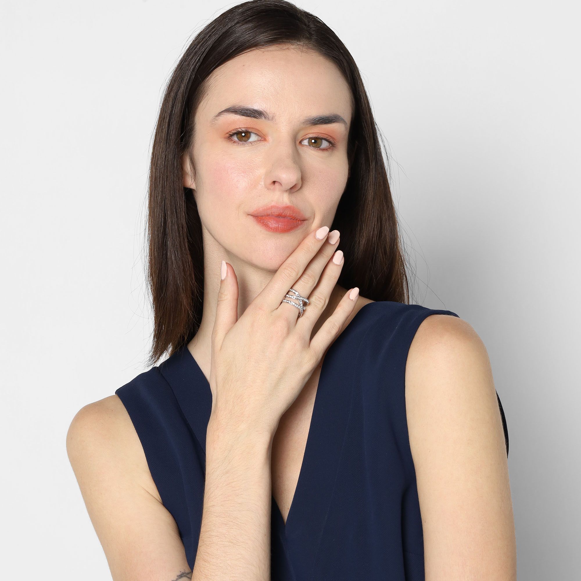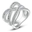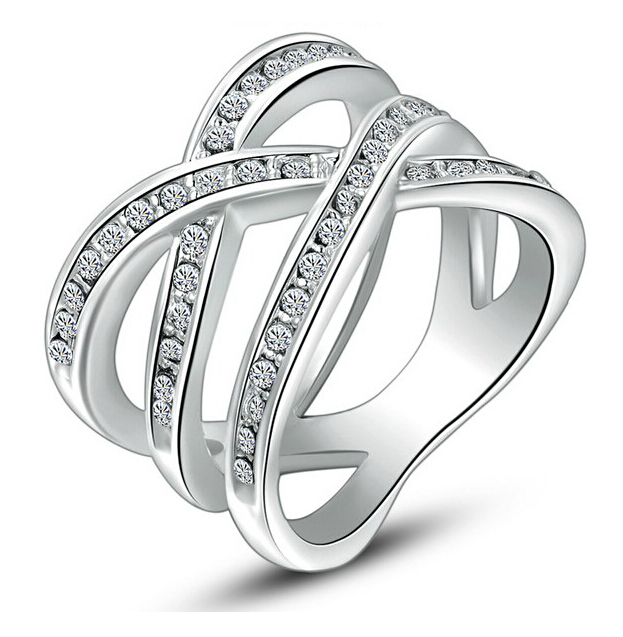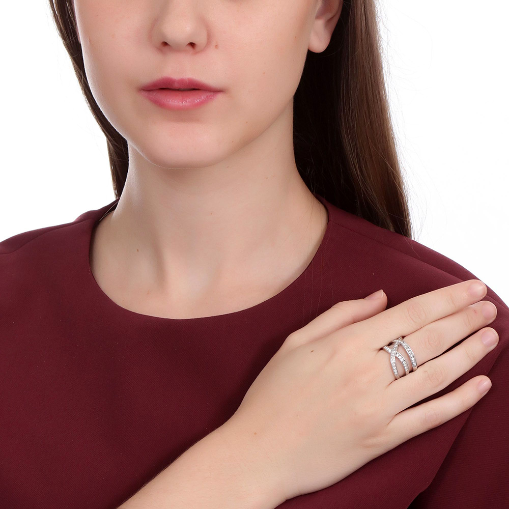 Delicado anillo, en baño de oro blanco de 18 quilates, diseño entrelazado, con incrustaciones de cristales en color blanco.