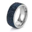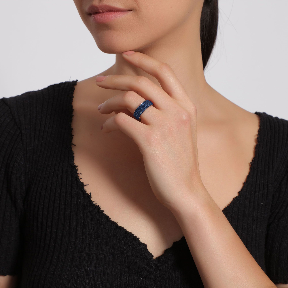 Anillo en baño de oro blanco de 18 quilates, sofisticado diseño, con incrustaciones de cristales en color azul oxford.