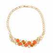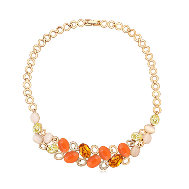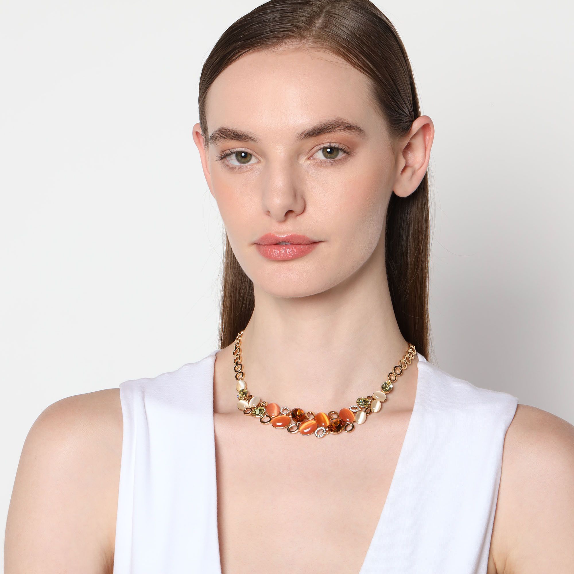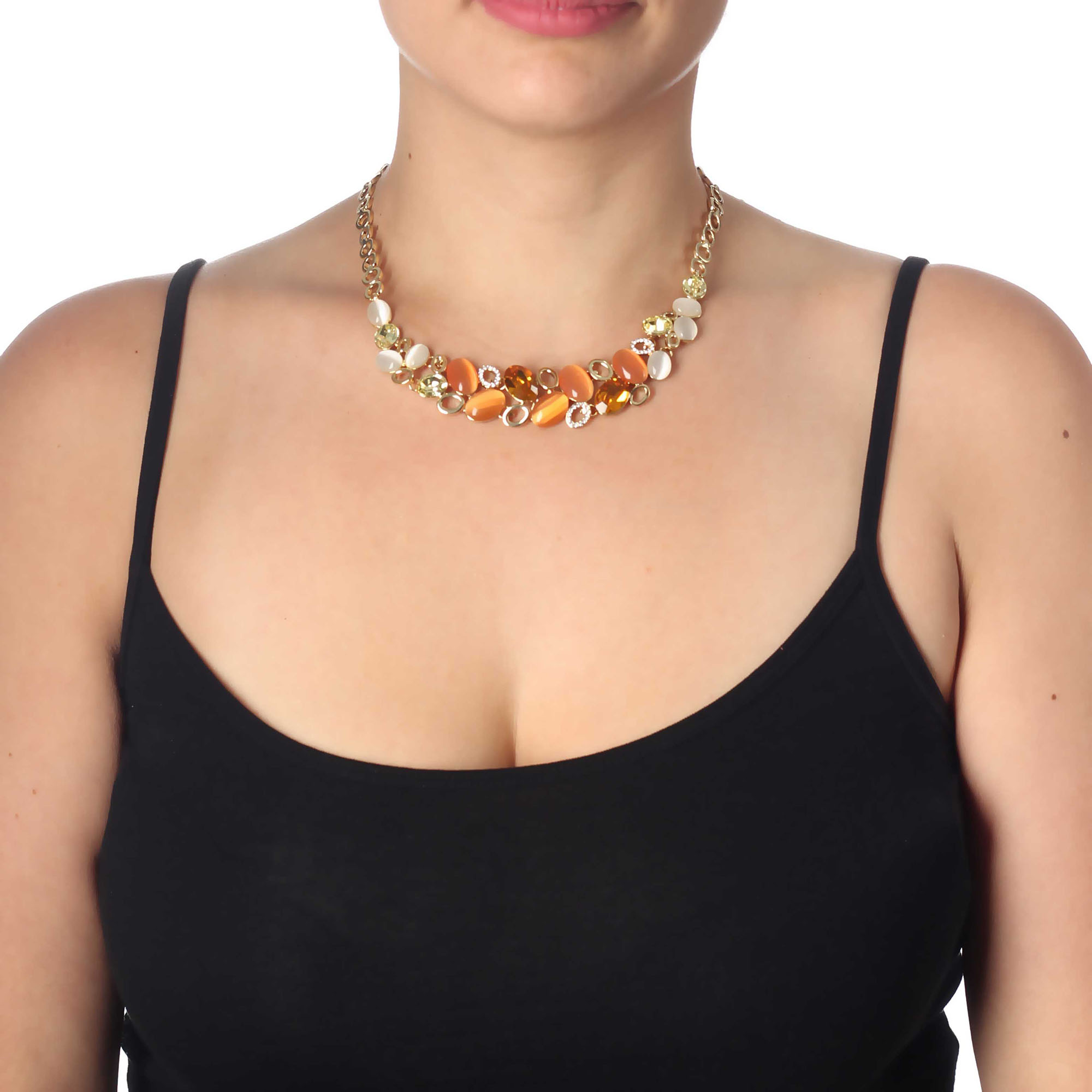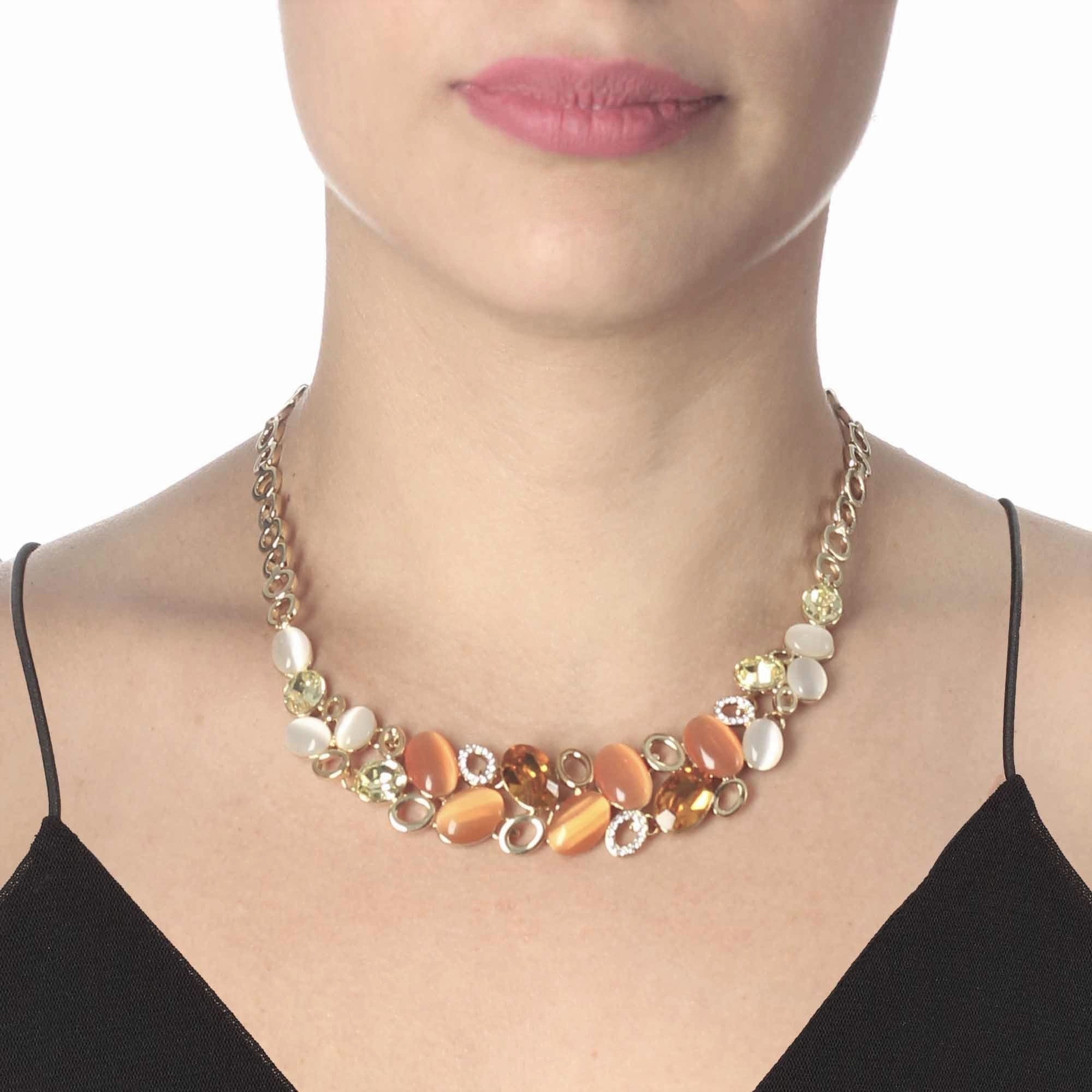Hermoso Collar en baño de oro amarillo de 18 quilates, fino diseño con incrustación de cristales en color ámbar y blanco. Fabricado en una estructura de aleación de platino con rodio sin níquel 1. joyería Hipoalergénica. 2. Incluye cajita de joyería. 3. Garantía de 30 días por defectos de fabrica.