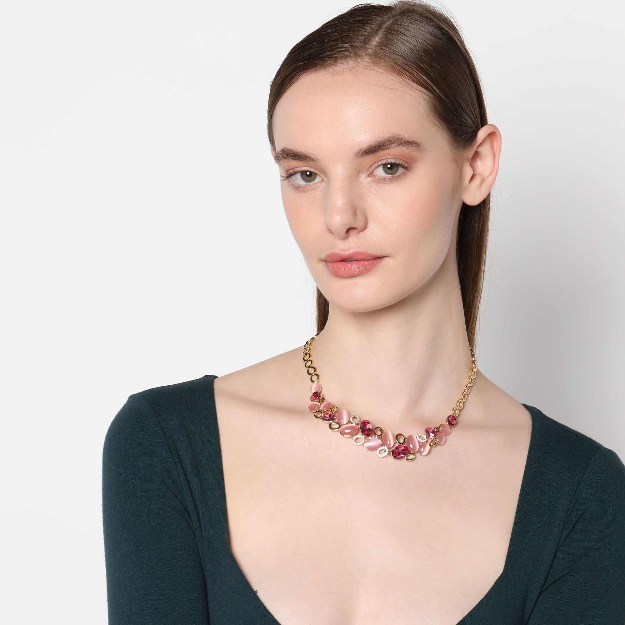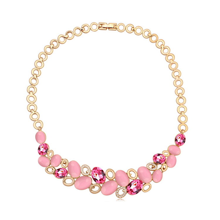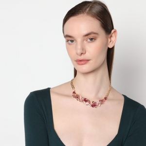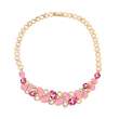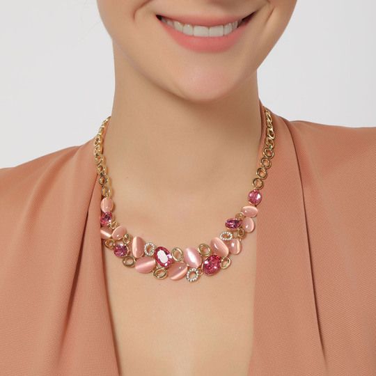 Hermoso collar en baño oro amarillo de 18 quilates, elegante diseño con incrustaciónes de cristales en color rosa, blanco y tornasol. Fabricado en una estructura de aleación de platino con rodio sin níquel. 1. Joyería hipoalergénica. 2. Incluye cajita de joyería. 3. Garantía de 30 días por defecto de fabrica.