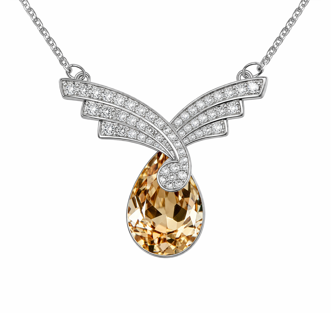 Collar en baño de oro banco de 18 quilates, fino diseño con cristal ámbar corte pera e incrustaciones de cristales blancos.