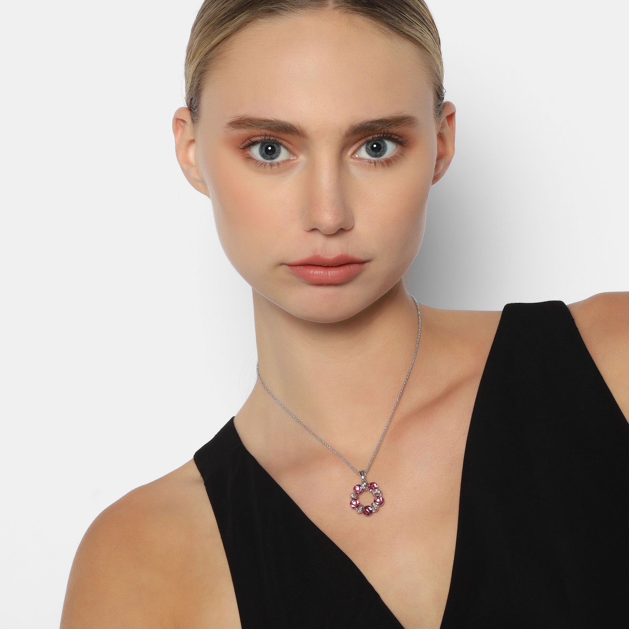 Dije con cadena en baño de oro banco de 18 quilates, diseño de flor con incrustación de cristales en color blanco y rosa. Fabricado en una estructura de aleación de platino con rodio sin níquel 1. joyería Hipoalergénica. 2. Incluye cajita de joyería. 3. Garantía de 30 días por defectos de fabrica.