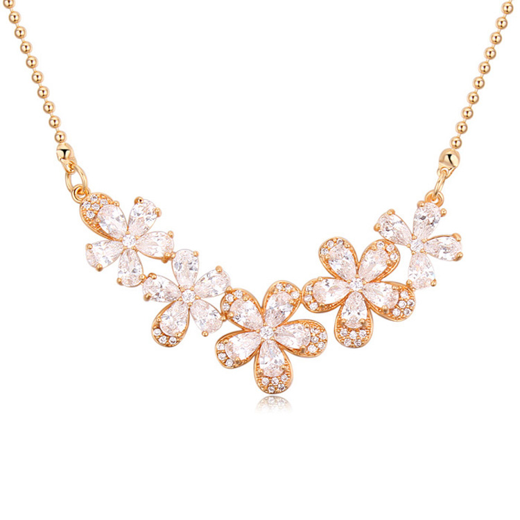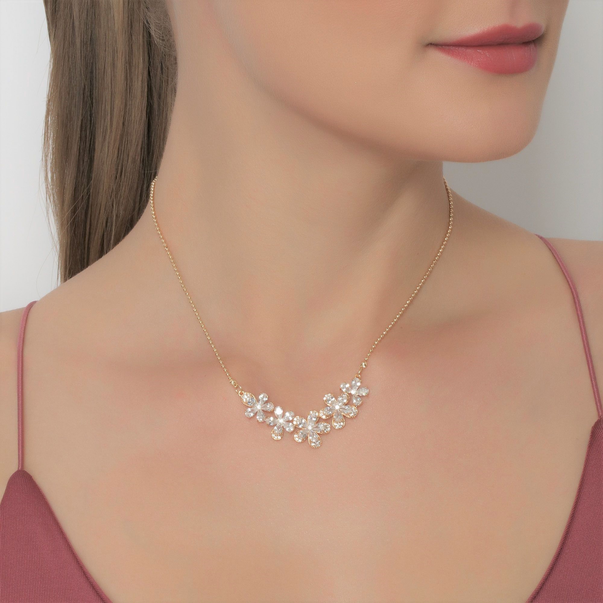 Collar en baño de oro amarillo de 18 quilates, diseño con incrustación de cristales en color blanco. Fabricado en una estructura de aleación de platino con rodio sin níquel 1. joyería Hipoalergénica. 2. Incluye cajita de joyería. 3. Garantía de 30 días por defectos de fabrica.