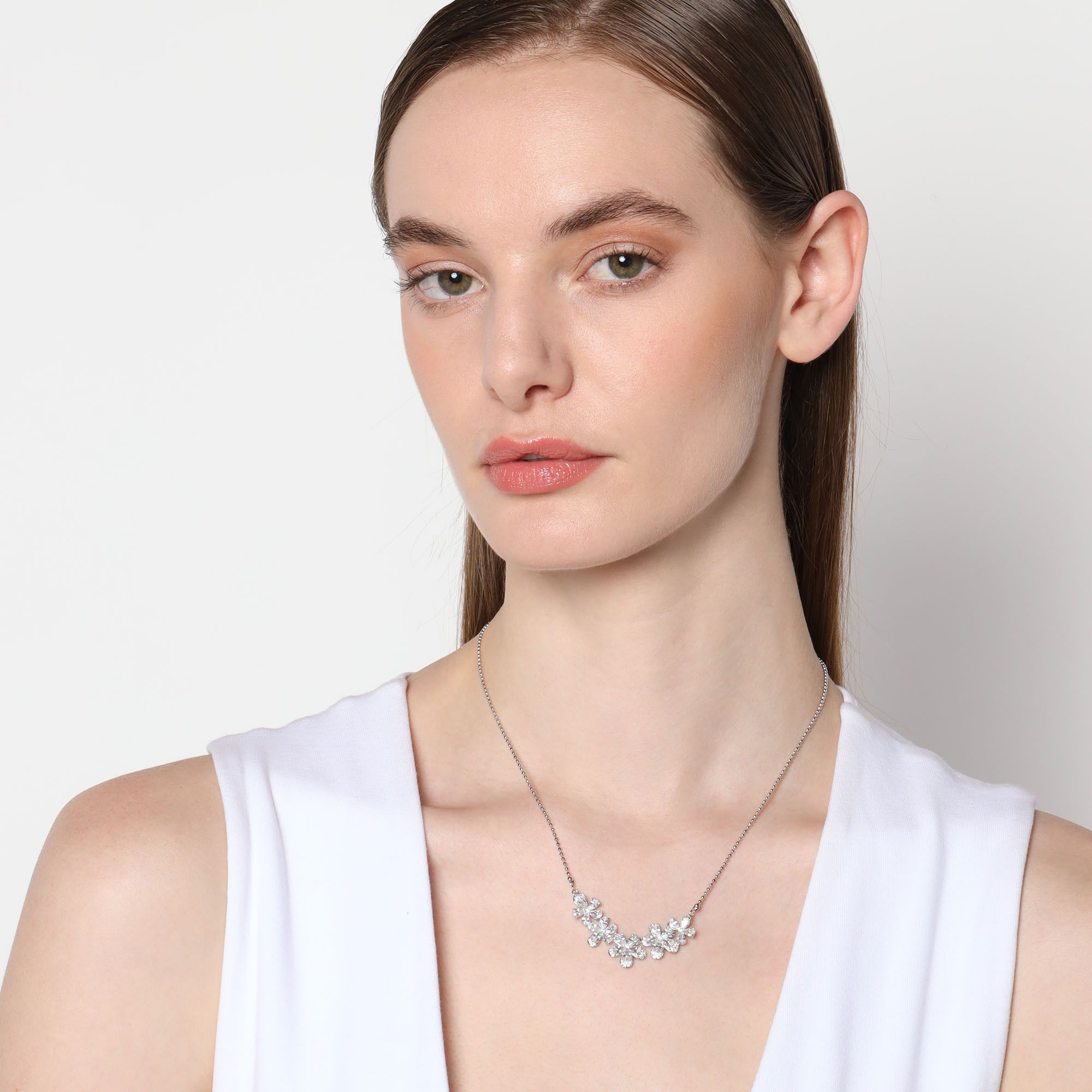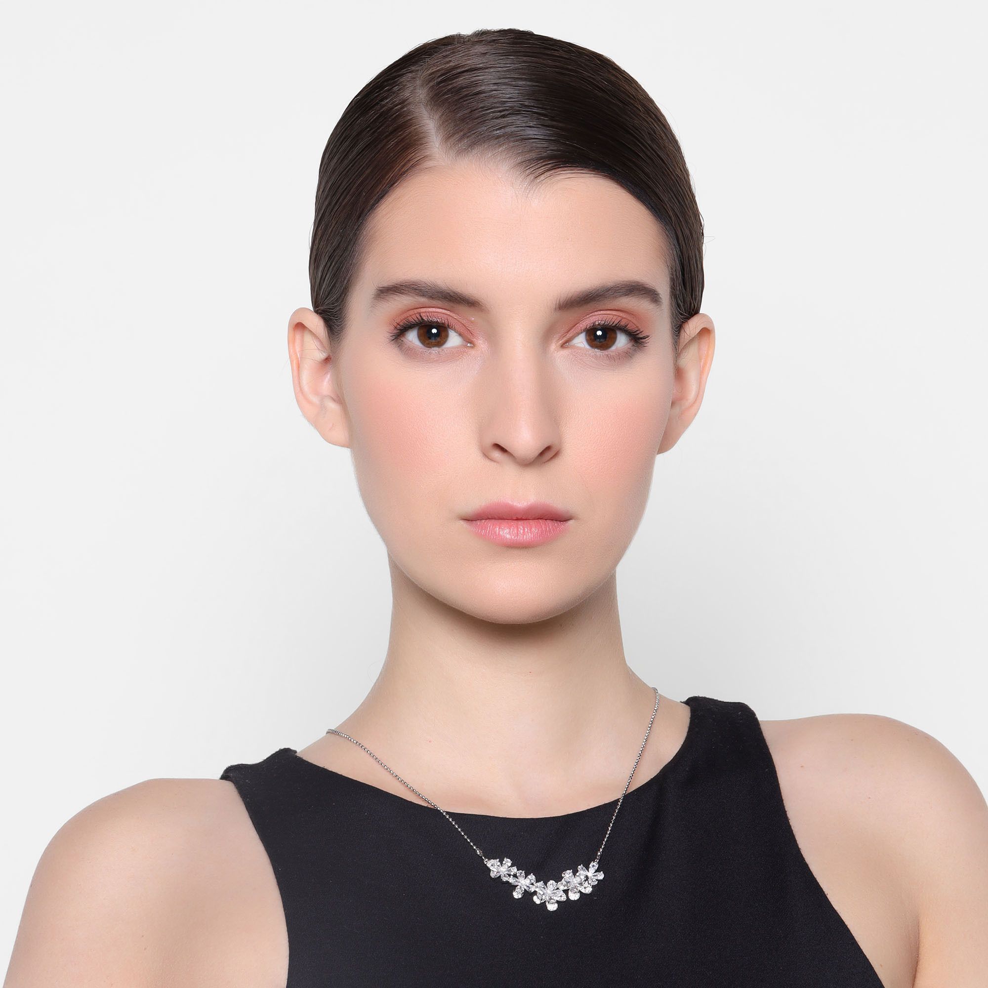 Collar en baño de oro blanco de 18 quilates, diseño con incrustación de cristales en color blanco. Fabricado en una estructura de aleación de platino con rodio sin níquel 1. joyería Hipoalergénica. 2. Incluye cajita de joyería. 3. Garantía de 30 días por defectos de fabrica.
