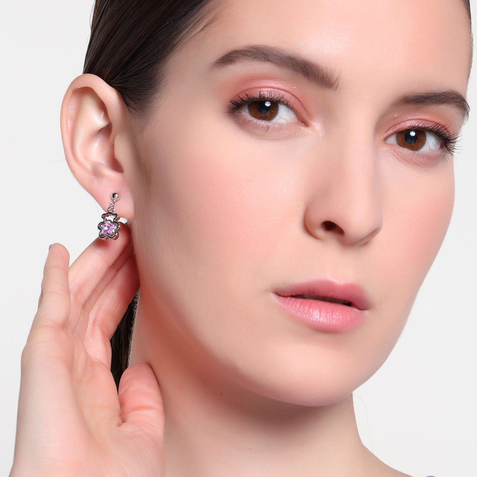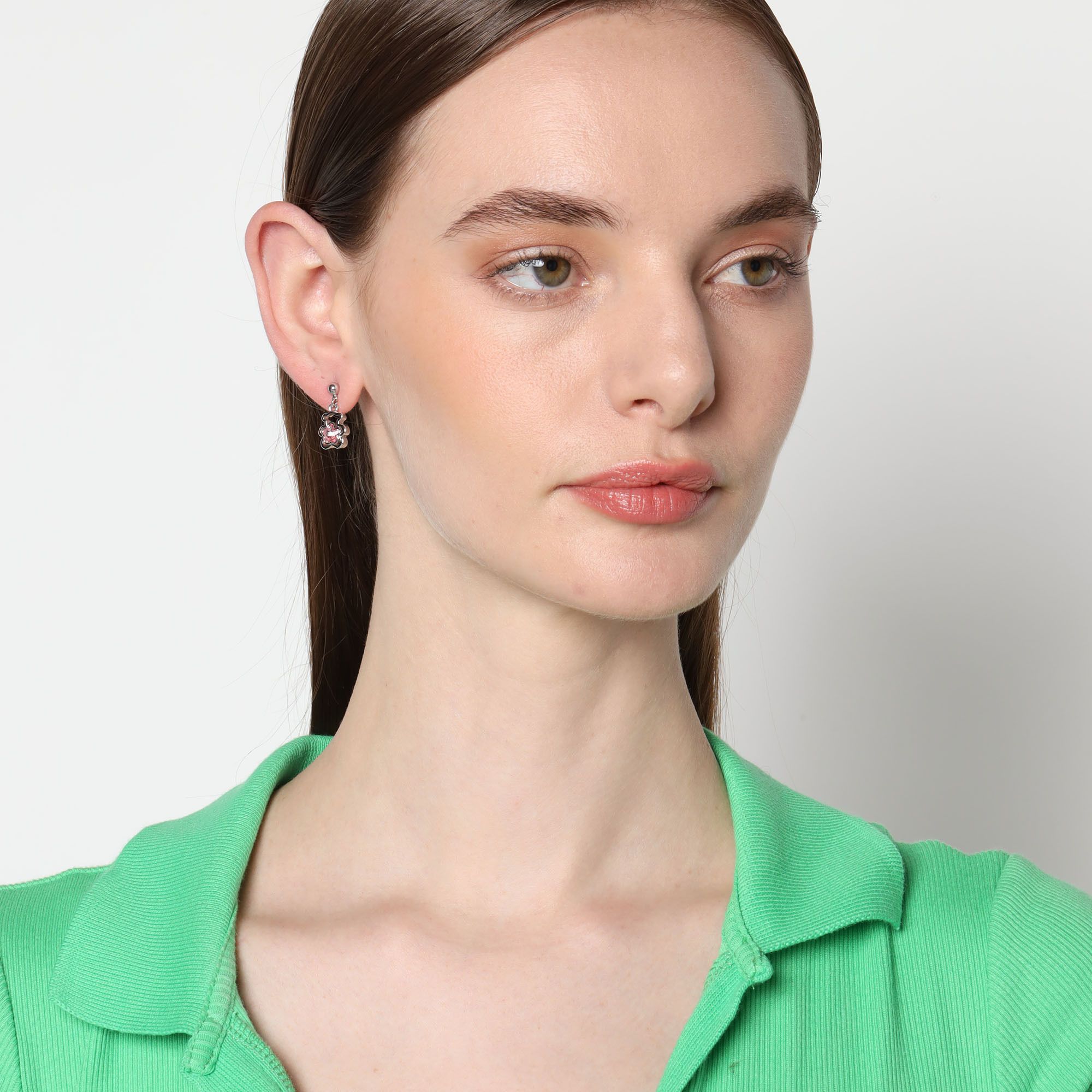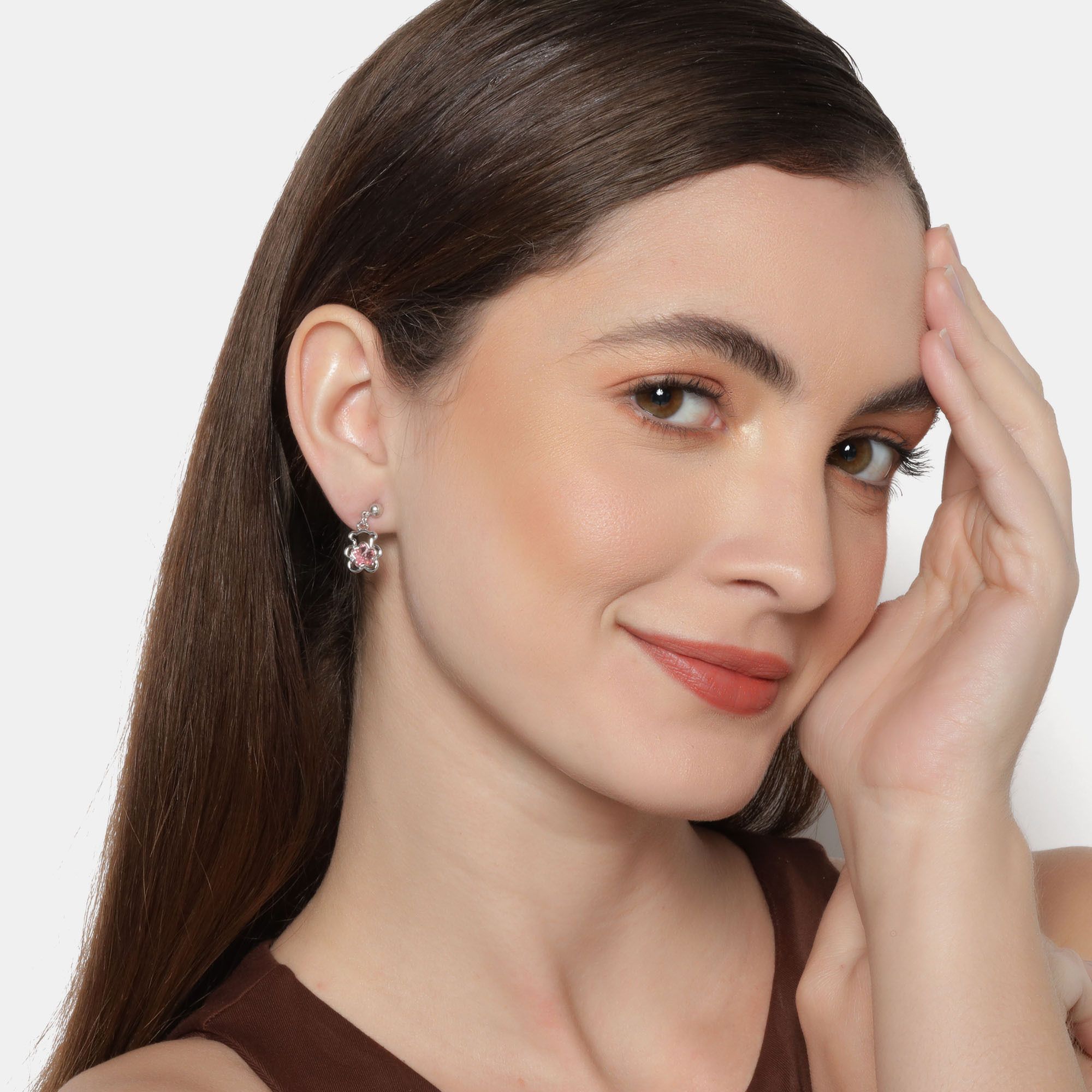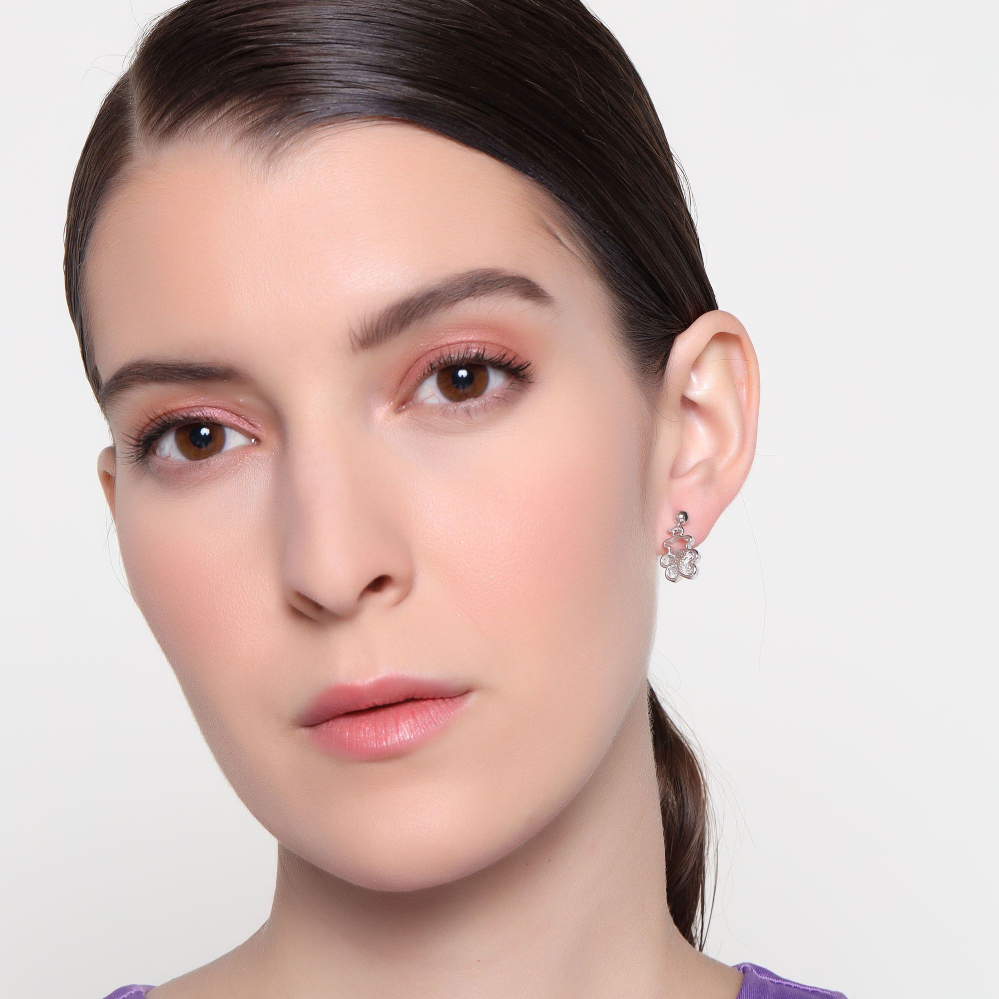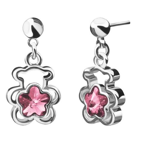 Hermosos aretes, en baño de oro blanco de 18 quilates, diseño de oso, con flor de cristal en color rosa. Fabricado en una estructura de aleación de platino con rodio sin níquel