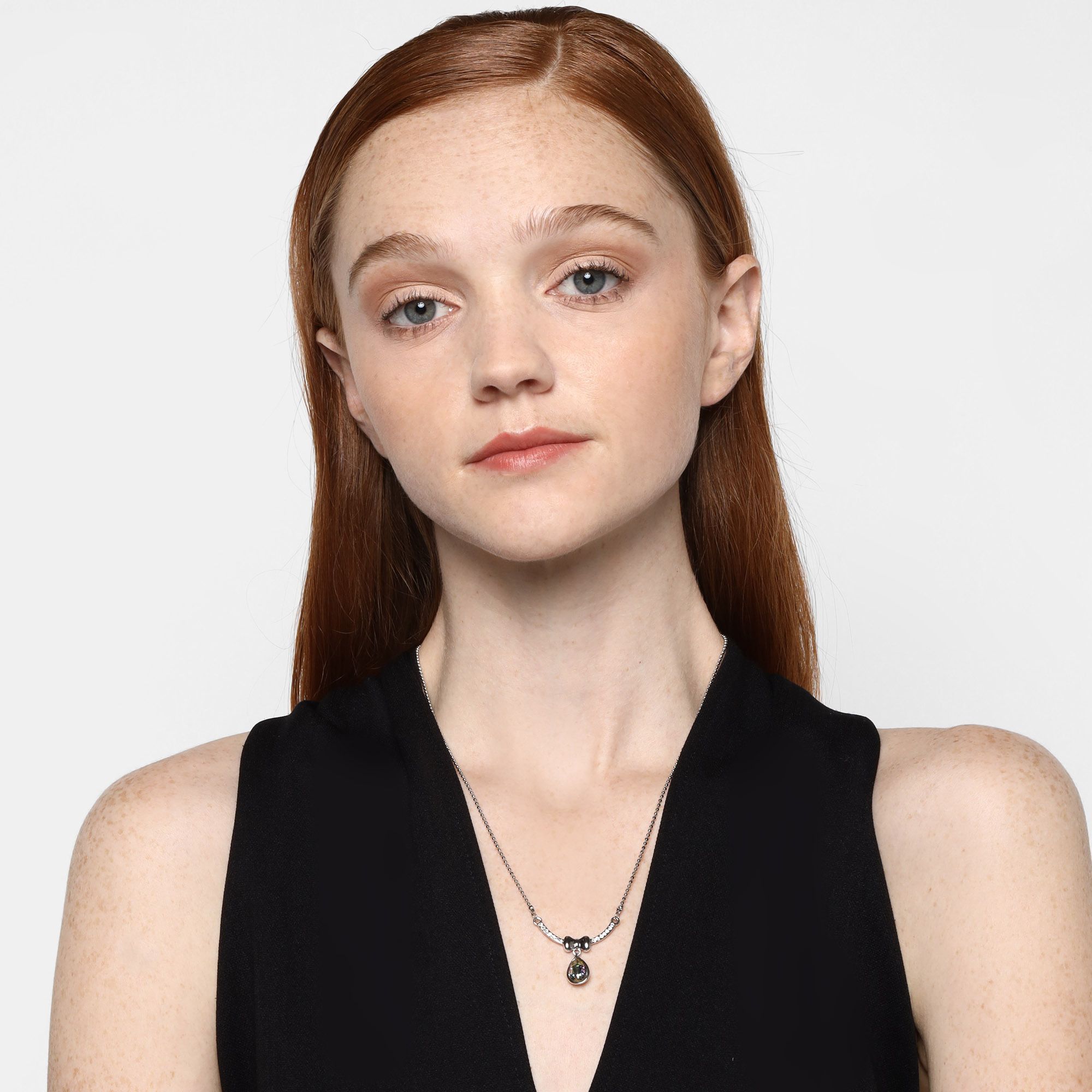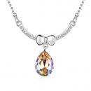 Elegante collar en baño de oro blanco de 18 quilates, detalle de moño, cristal ámbar corte pera e incrustaciones de cristales blancos.