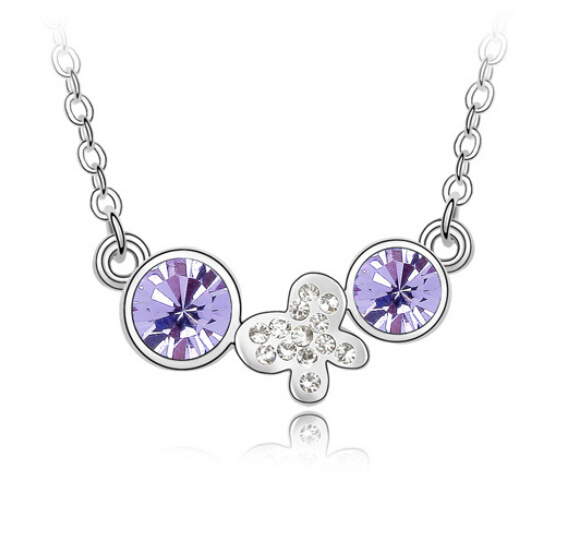 Dije con cadena en baño de oro blanco de 18 quilates, fino diseño de mariposa y círculos con incrustación de cristales en color blanco y morado. Fabricado en una estructura de aleación de platino con rodio sin níquel 1. joyería Hipoalergénica. 2. Incluye cajita de joyería. 3. Garantía de 30 días por defectos de fabrica.