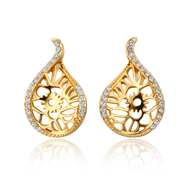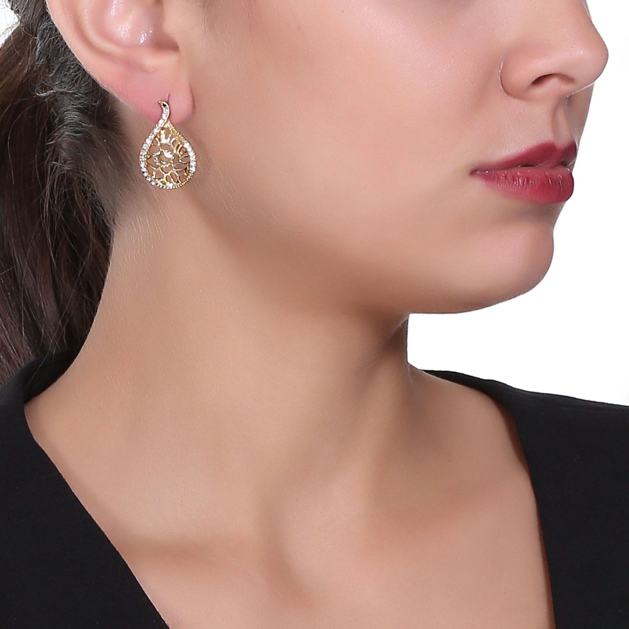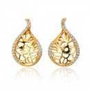 Aretes en baño de oro amarillo de 18 quilates, diseño de gota, con flores caladas e incrustación de cristales en color blanco. Fabricado en una estructura de aleación de platino con rodio sin níquel