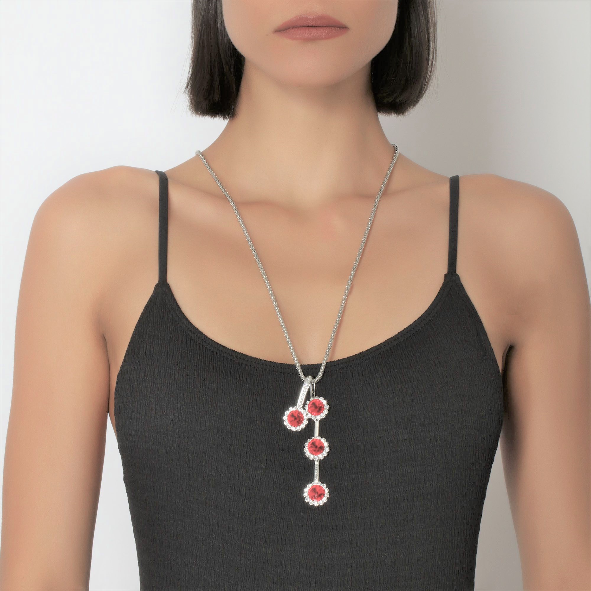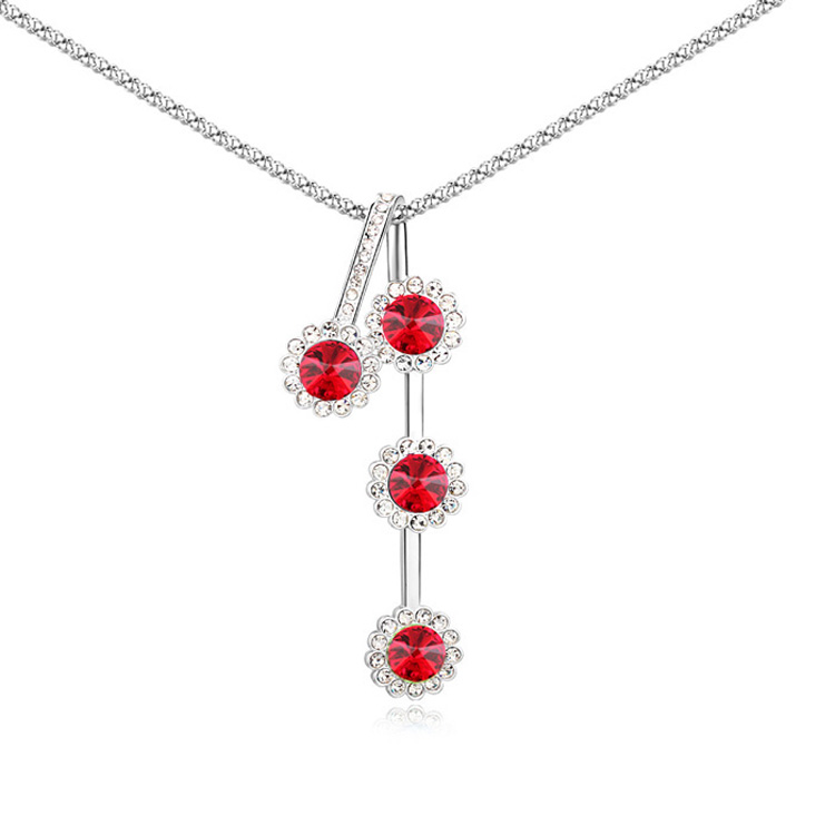 Collar en baño de oro blanco de 18 quilates, diseño de flores con cristales rojos corte redondo e incrustaciones de cristales blancos.