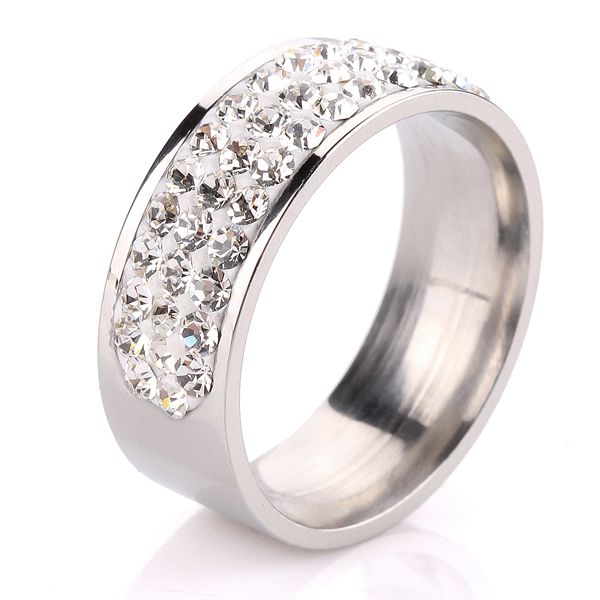 Lindo anillo en acero inoxidable, diseño ranurado, con incrustaciones de cristales en color blanco.
