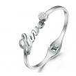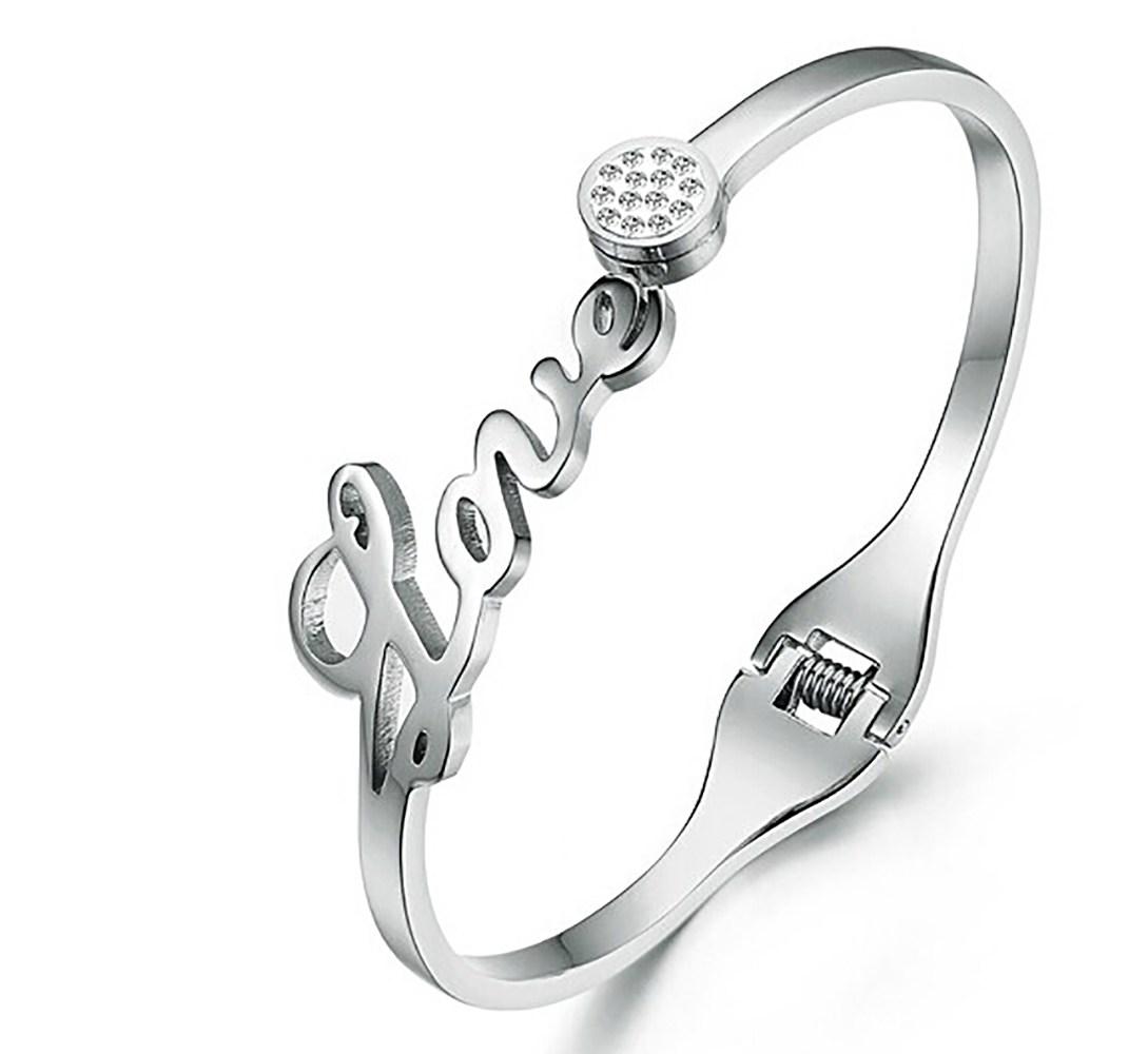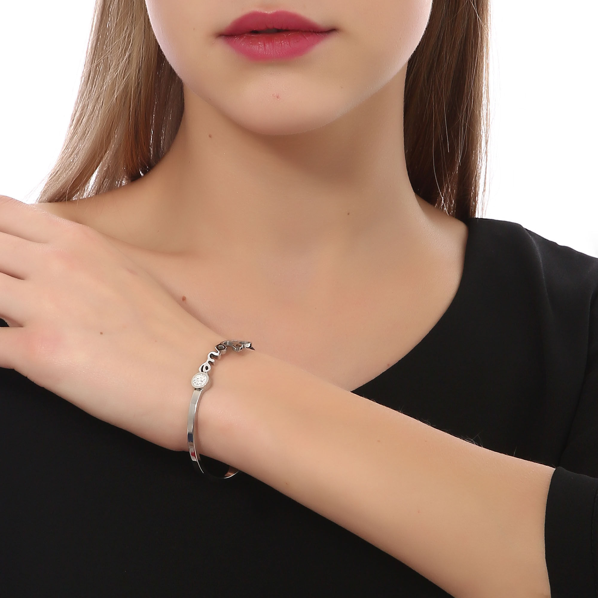 Hermoso brazalete, en baño de oro blanco de 18 quilates, fino diseño con palabra "Love", e incrustaciones de cristales en color blanco.
