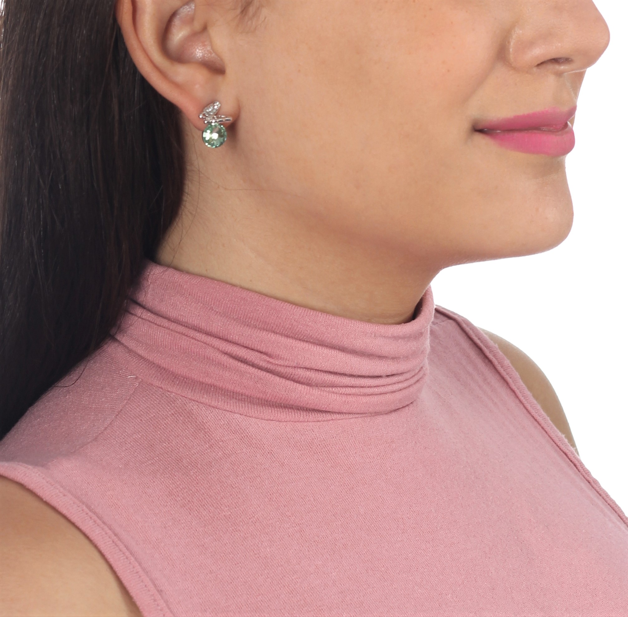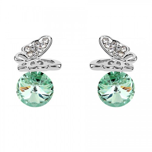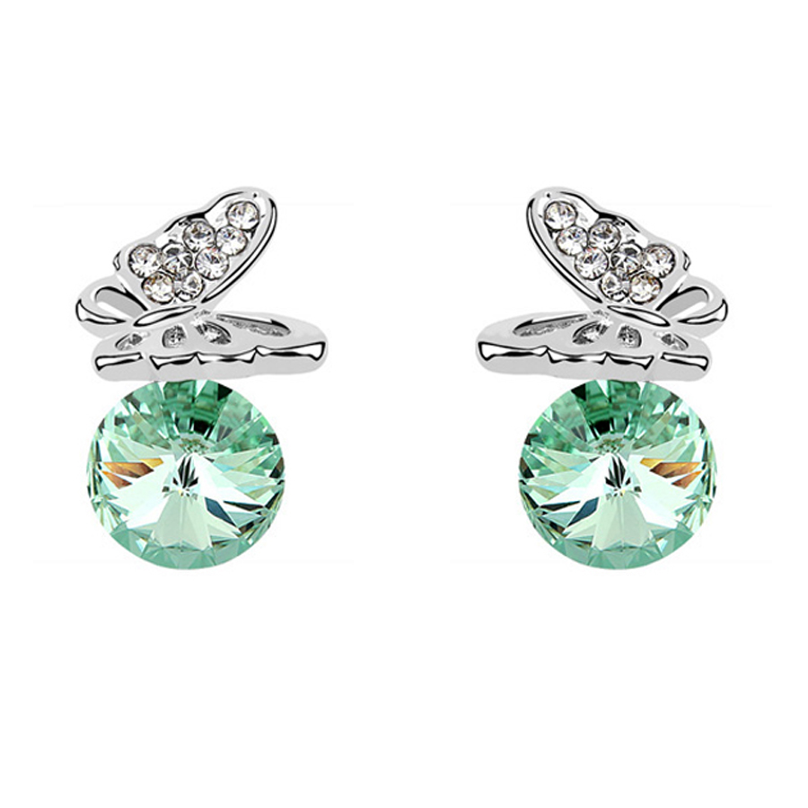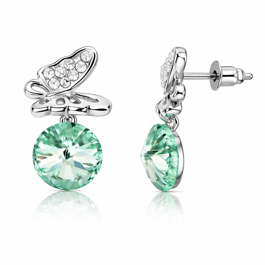 Tiernos aretes, en baño de oro blanco de 18 quilates, diseño de mariposa, con cristal verde aqua corte brillante e incrustación de cristales blancos. Fabricado en una estructura de aleación de platino con rodio sin níquel.