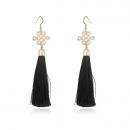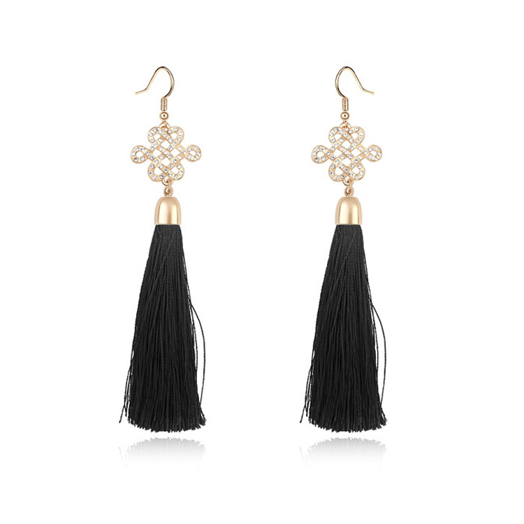 Elegantes aretes en baño de oro amarillo de 18 quilates, diseño de nudo chino, con incrustación de cristales en color blanco y flecos de hilos negros. Fabricado en una estructura de aleación de platino con rodio sin níquel.