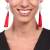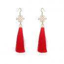 Elegantes aretes, en baño de oro amarillo de 18 quilates, diseño de nudo chino, con incrustación de cristales en color blanco y flecos de hilos rojos. Fabricado en una estructura de aleación de platino con rodio sin níquel
