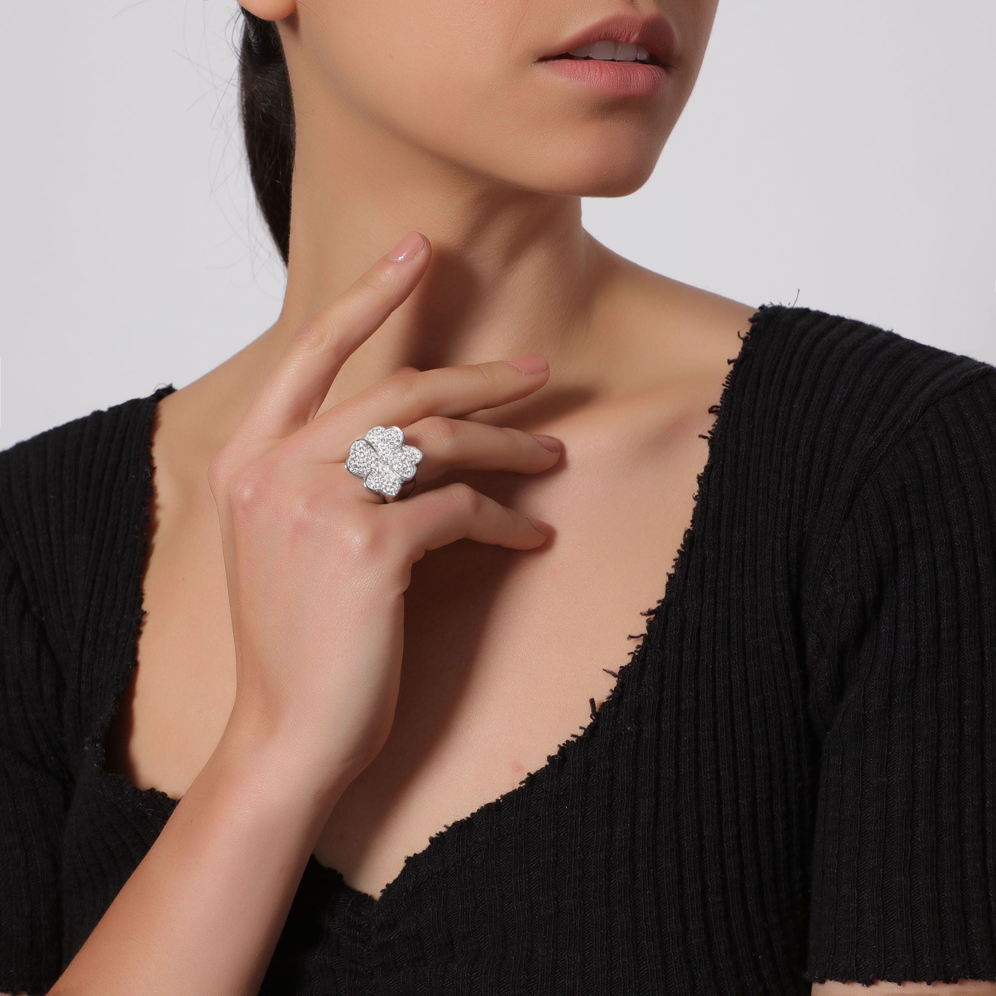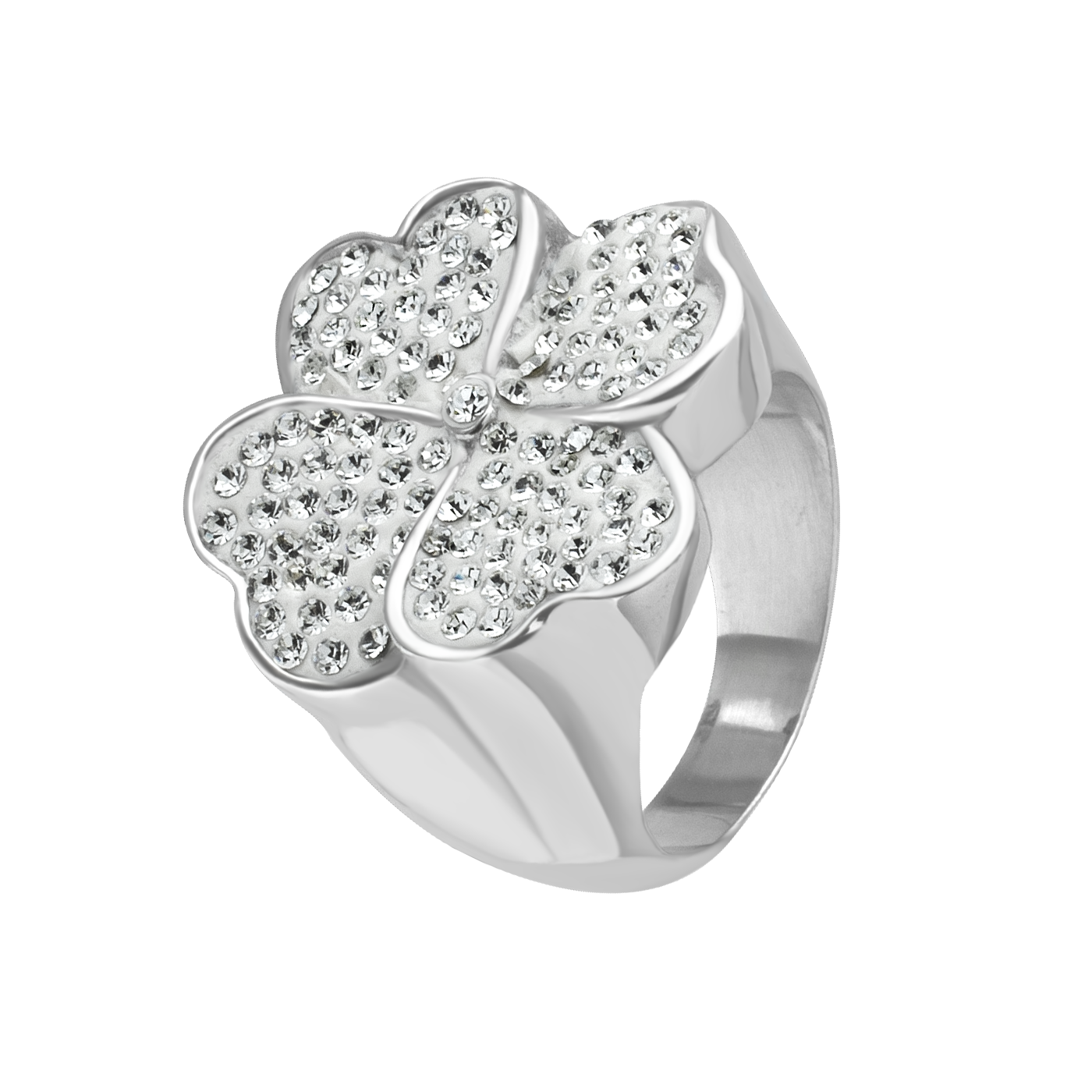 Anillo en acero inoxidable color blanco, diseño de trébol de 4 hojas, con fondo blanco e incrustaciones de cristales blancos
