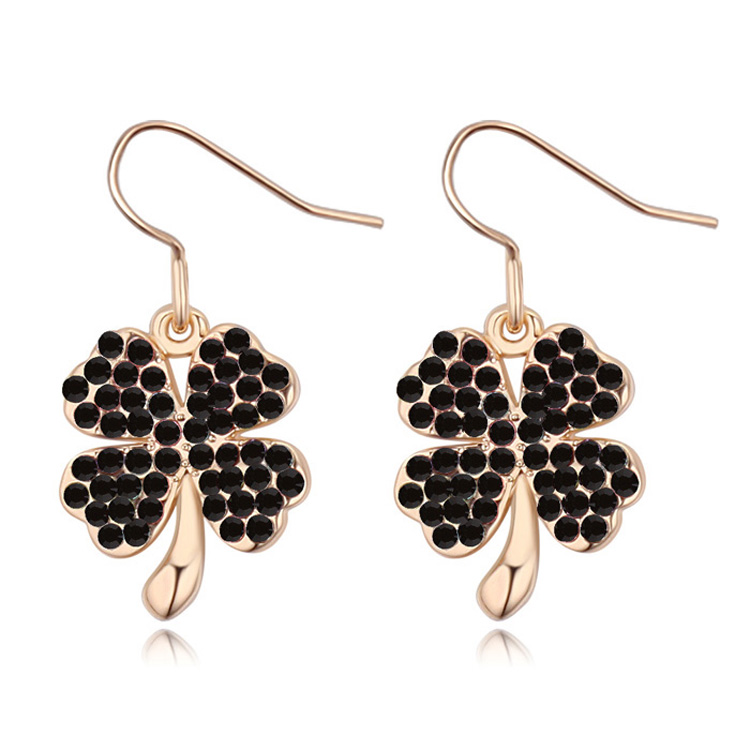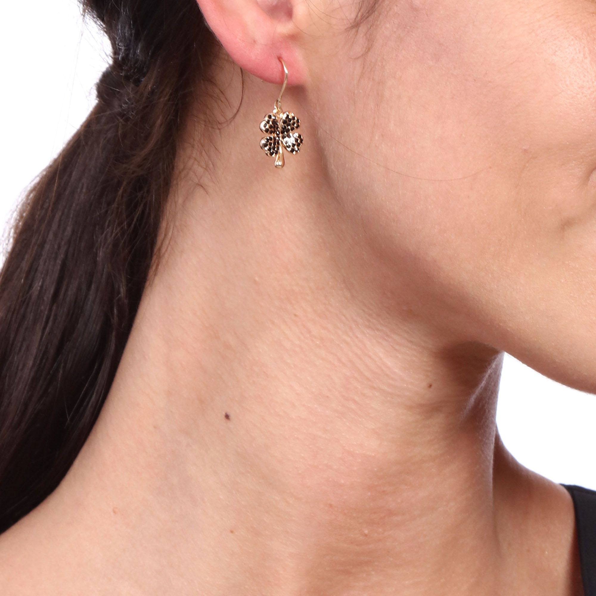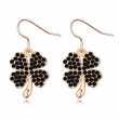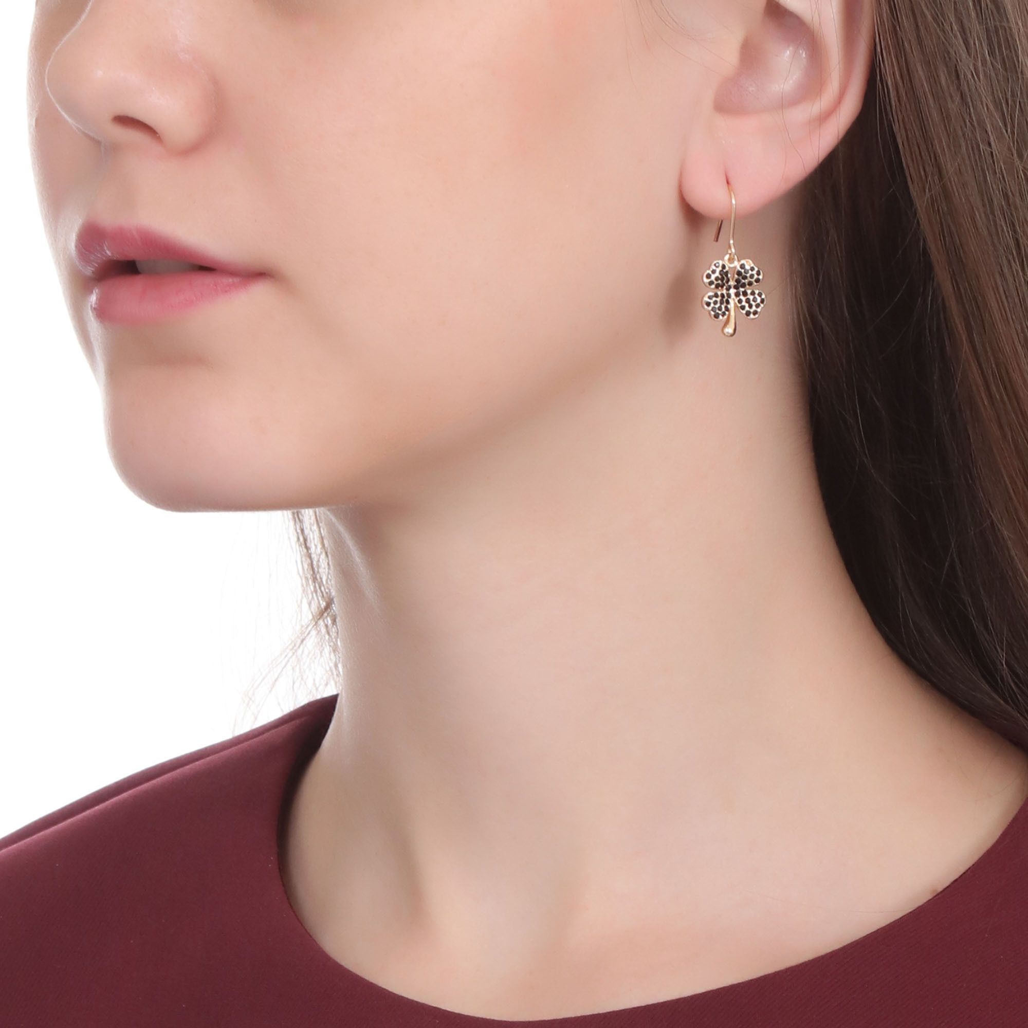 Preciosos aretes, en baño de oro amarillo de 18 quilates, diseño de trébol, con incrustación de cristales en color negro. Fabricado en una estructura de aleación de platino con rodio sin níquel