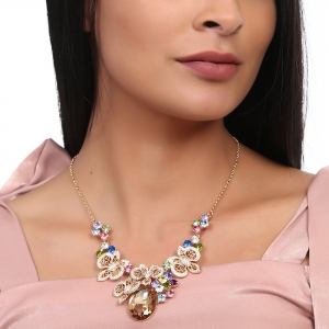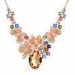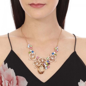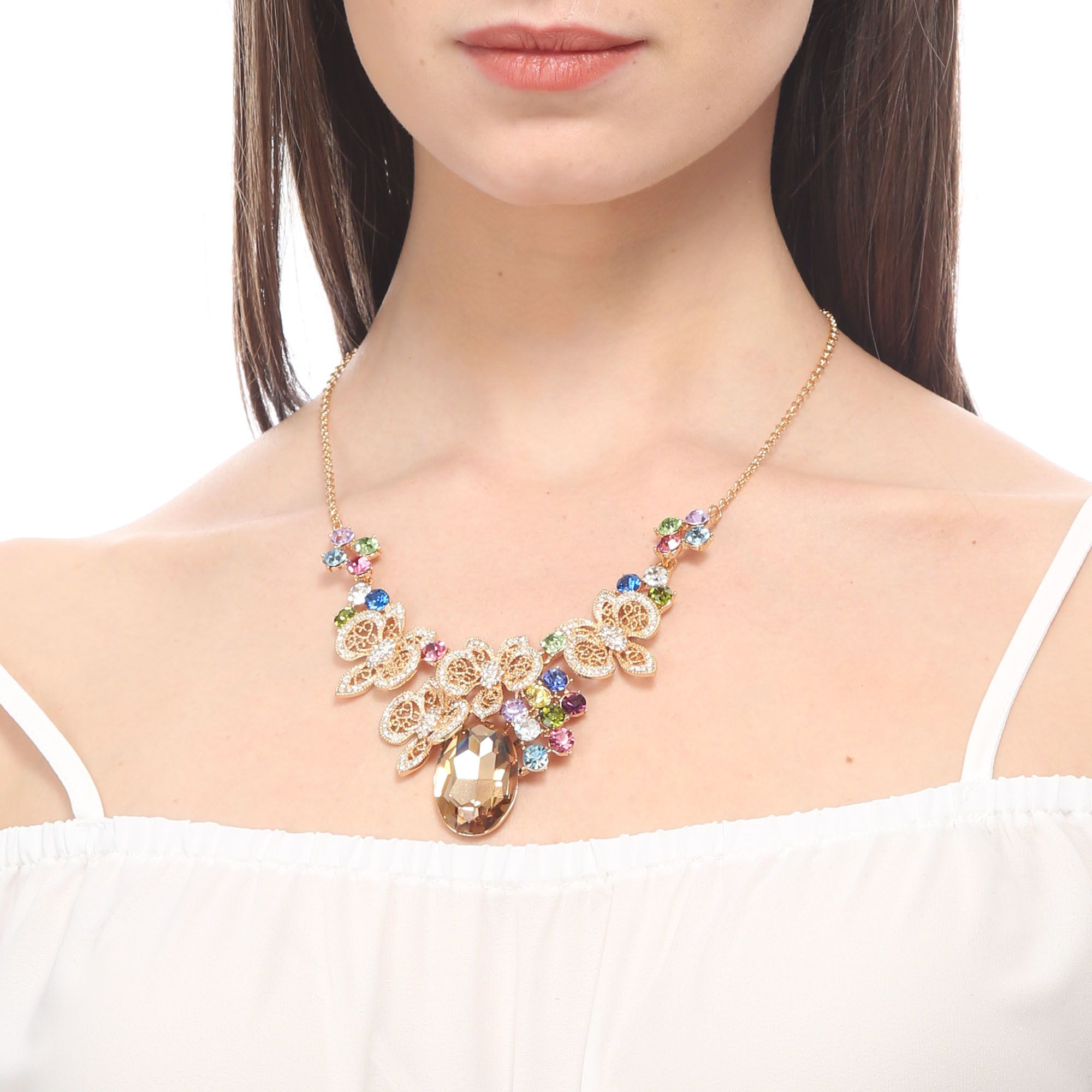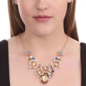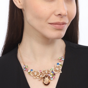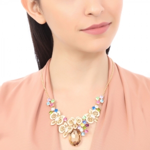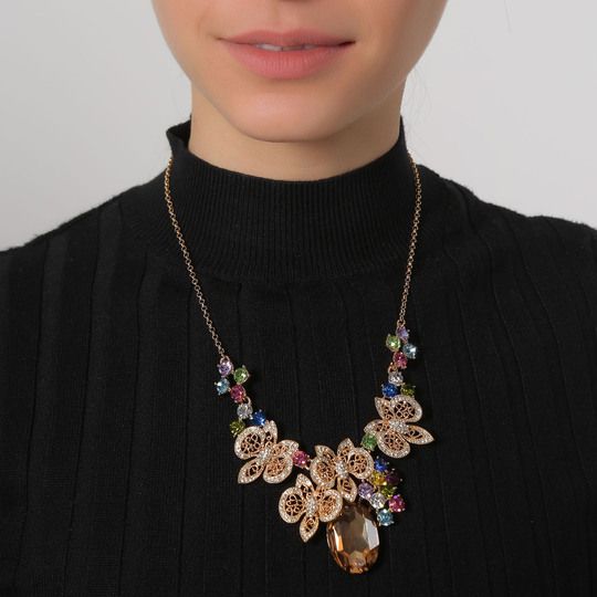Collar en baño de oro amarillo de 18 quilates, fino diseño de mariposas, con cristal ámbar corte oval e incrustación de cristales en colores.