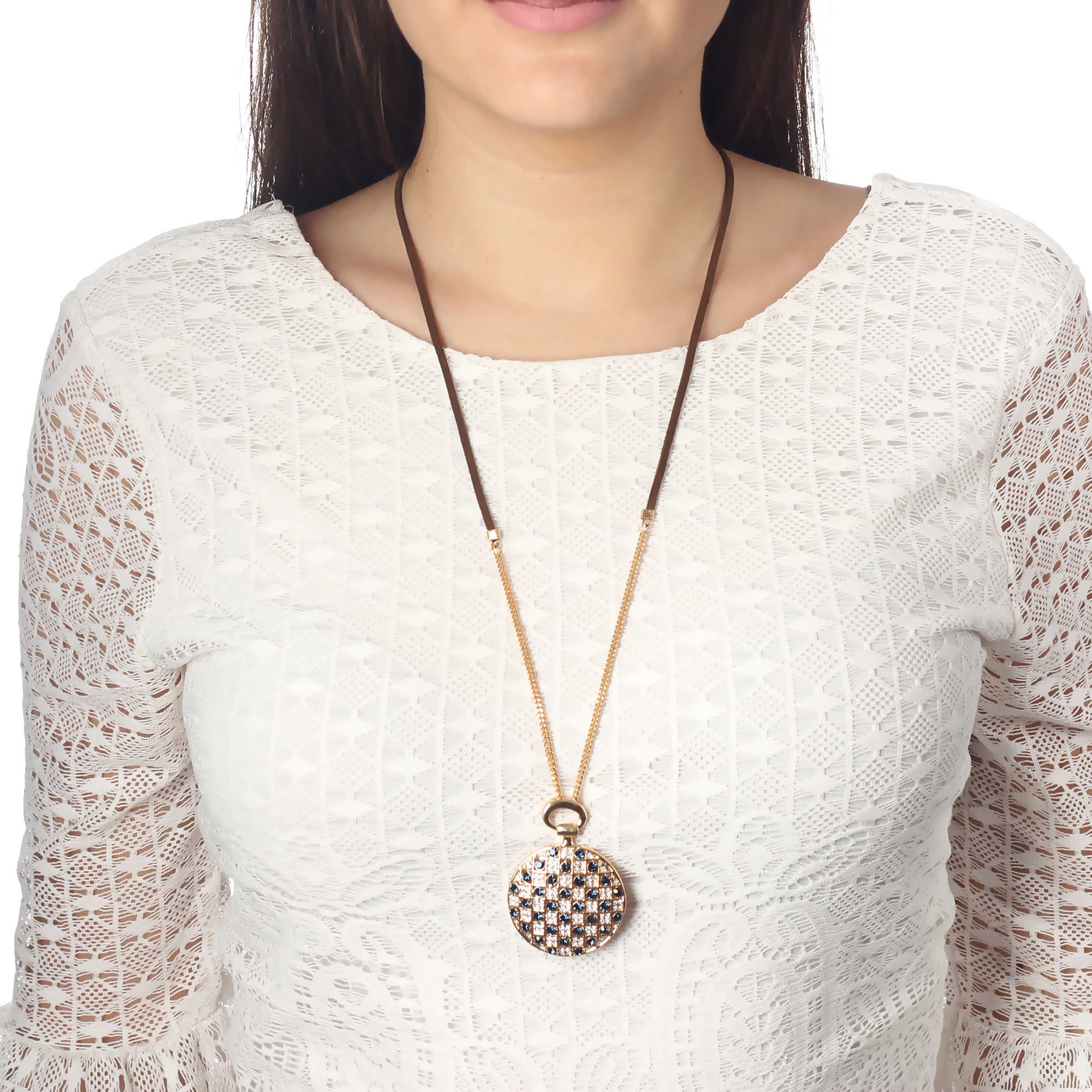 Collar en baño de oro amarillo de 18 quilates, diseño de círculo con critales azules y blancos.