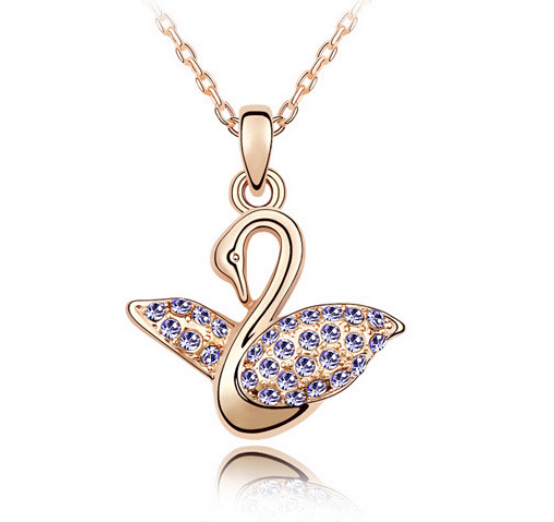 Elegante Dije en baño de oro amarillo de 18 quilates, diseño de cisne con incrustación de cristales en color morado. Cuenta con una cadena de 40 cm, con extención de 5 cm. Fabricado en una estructura de aleación de platino con rodio sin níquel 1. joyería Hipoalergénica. 2. Incluye cajita de joyería. 3. Garantía de 30 días por defectos de fabrica.