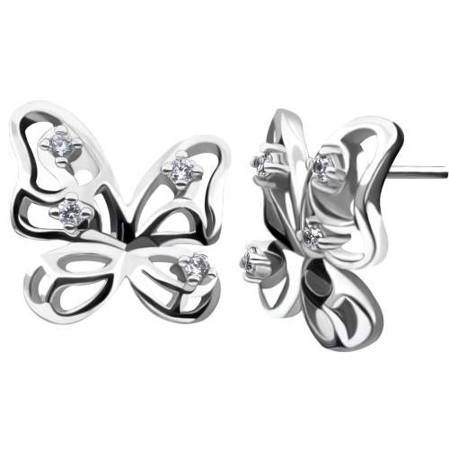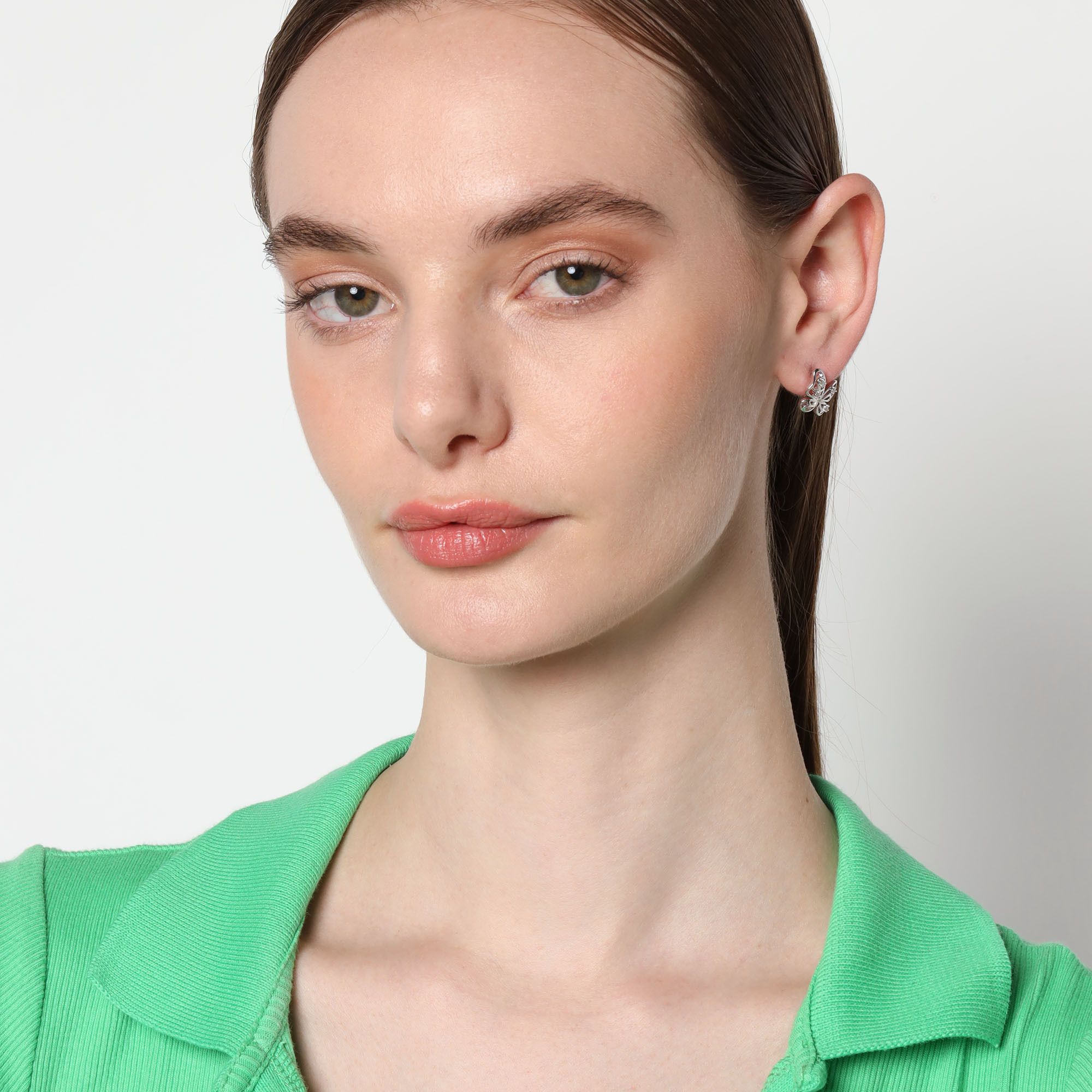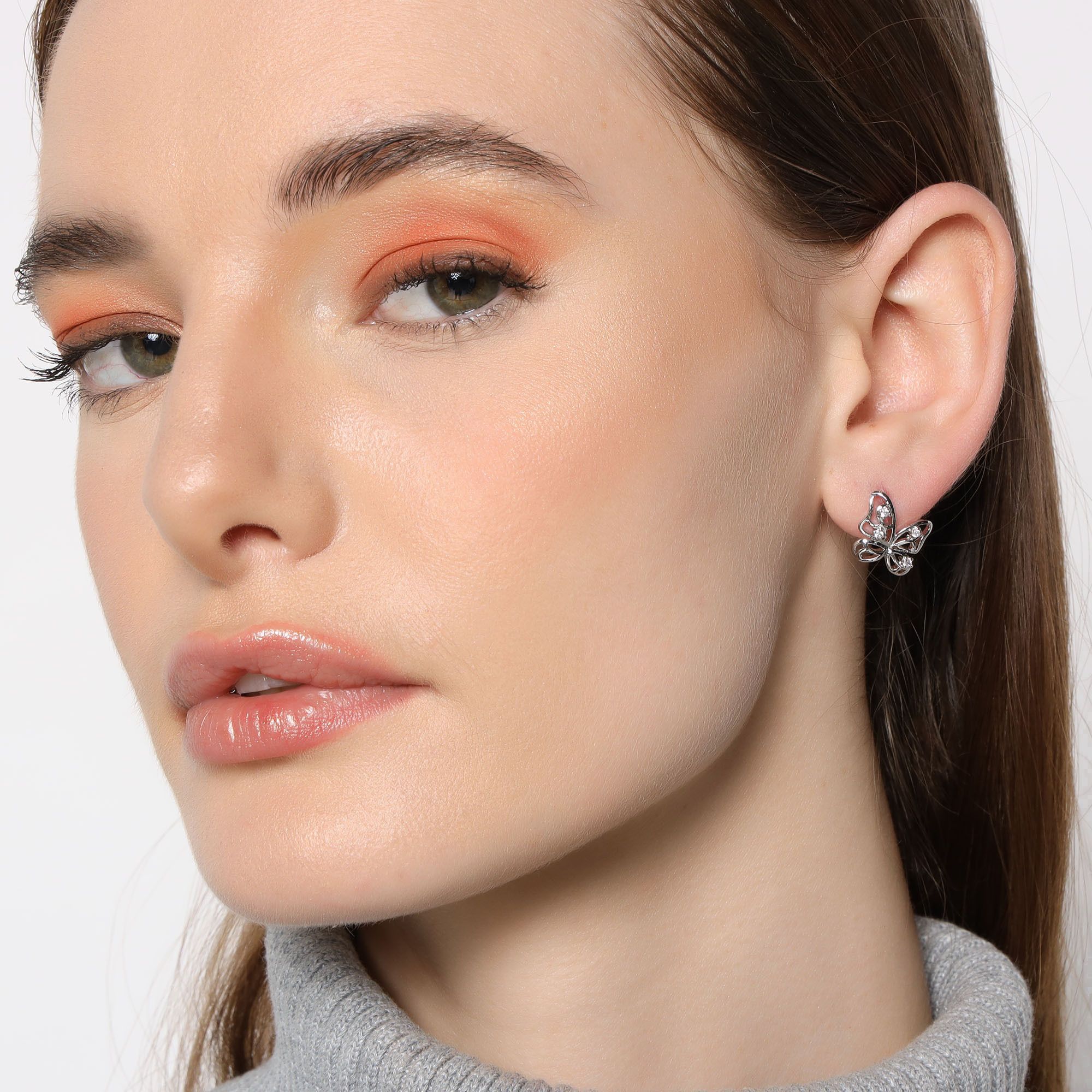 Lindos aretes, en baño de oro blanco de 18 quilates, diseño de mariposa, con detalles calados e incrustación de cristales en color blanco.