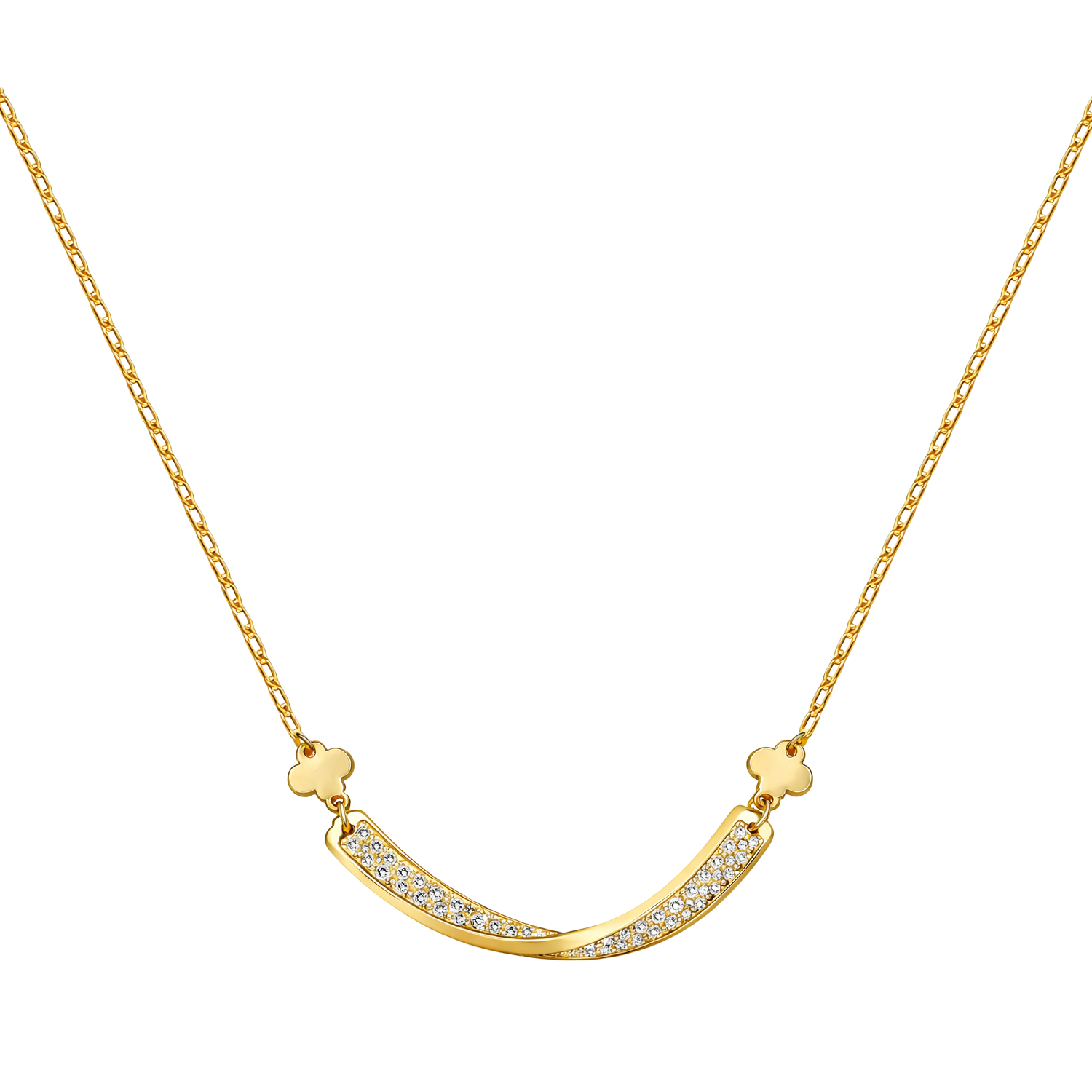 Precioso Collar en baño de oro amarillo de 18 quilates, Elegante diseño con incrustación de cristales en color blanco. Fabricado en una estructura de aleación de platino con rodio sin níquel 1. joyería Hipoalergénica. 2. Incluye cajita de joyería. 3. Garantía de 30 días por defectos de fabrica.