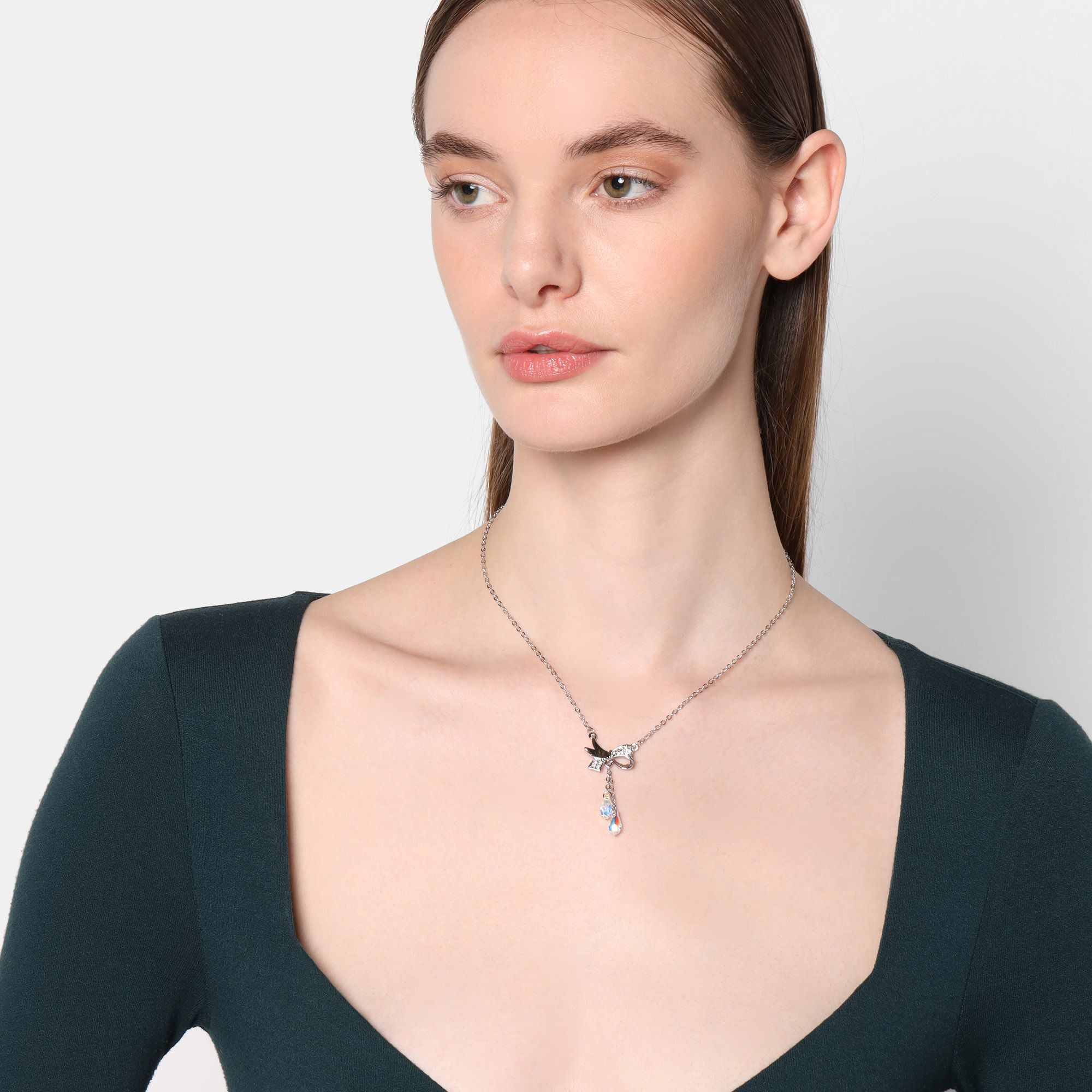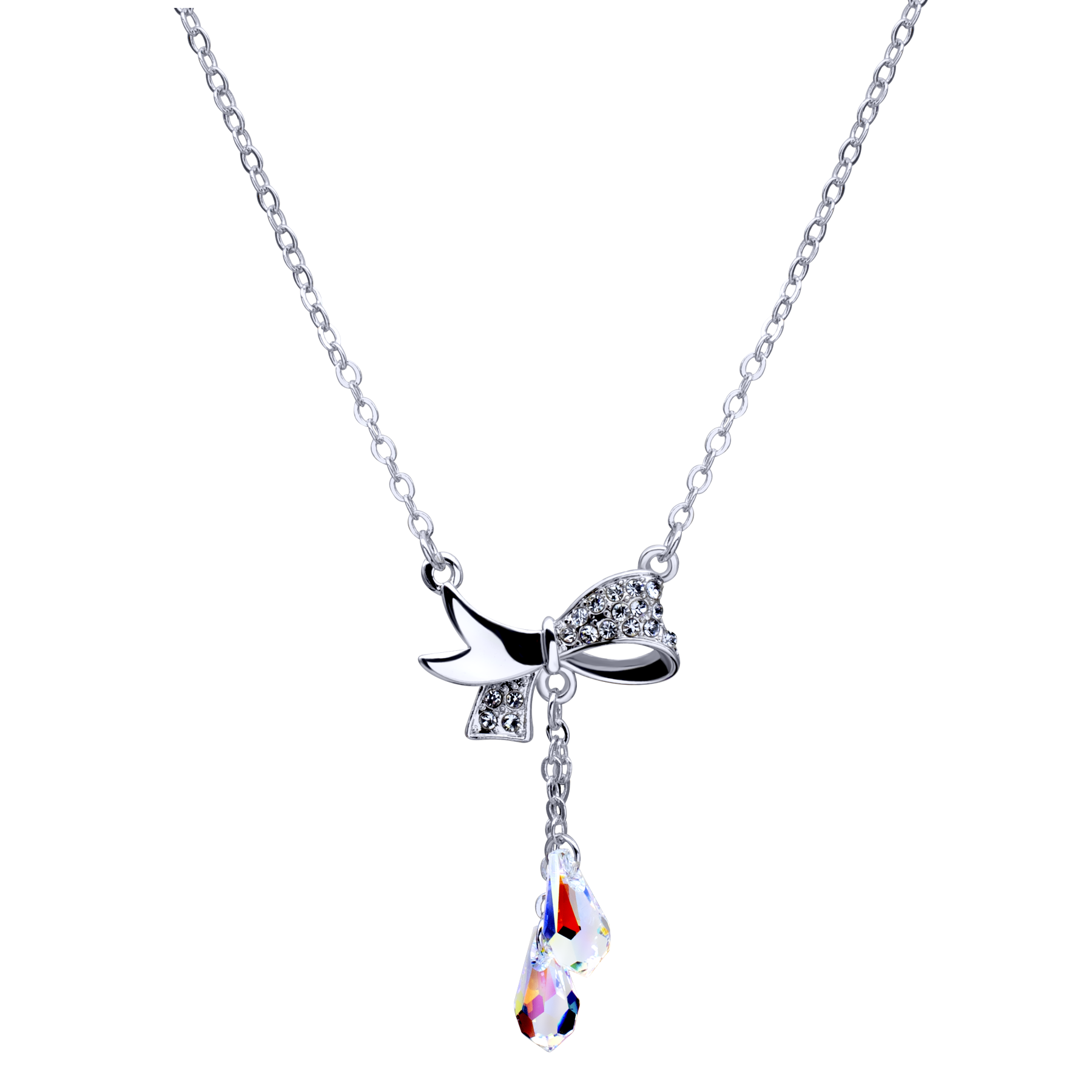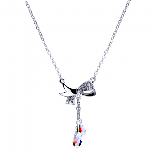 Lindo Collar en baño de oro blanco de 18 quilates, diseño de moño con incrustación de cristales en color blanco y tornasol. Fabricado en una estructura de aleación de platino con rodio sin níquel 1. joyería Hipoalergénica. 2. Incluye cajita de joyería. 3. Garantía de 30 días por defectos de fabrica.