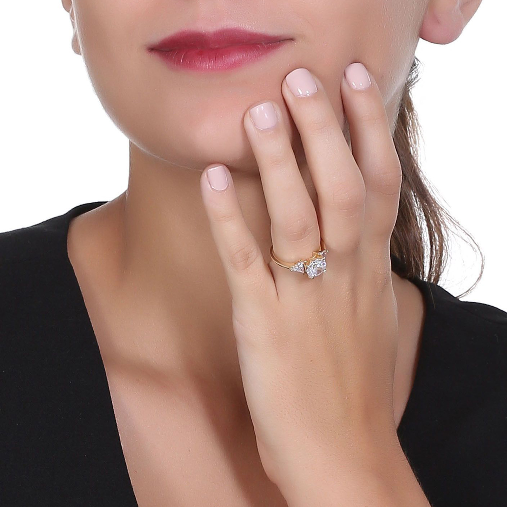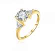 Anillo en baño de oro amarillo de 18 quilates, fino diseño geométrico, con incrustaciones de cristales blancos corte brillante y corte trillion.