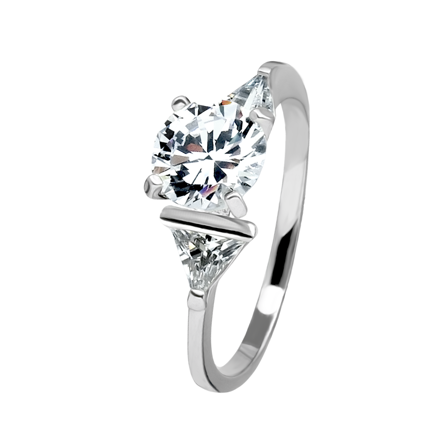 Anillo en baño de oro blanco de 18 quilates, diseño geométrico, con incrustaciones de cristales blancos corte brillante y corte trillion.