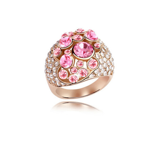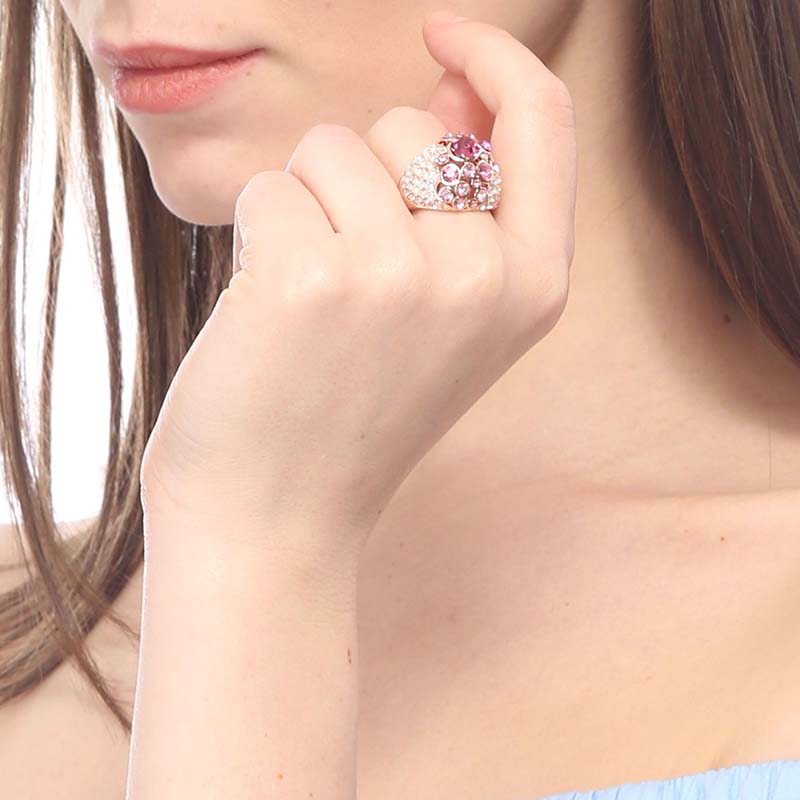 Anillo en baño de oro rosa de 18 quilates, fino diseño calado, estilo convexo, con incrustaciones de cristales en color blanco y rosa.