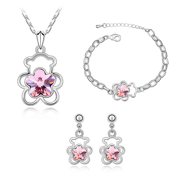 Juego de aretes, pulsera y dije en baño de oro blanco de 18 quilates, diseño de osos con incrustación de cristales en color rosa.