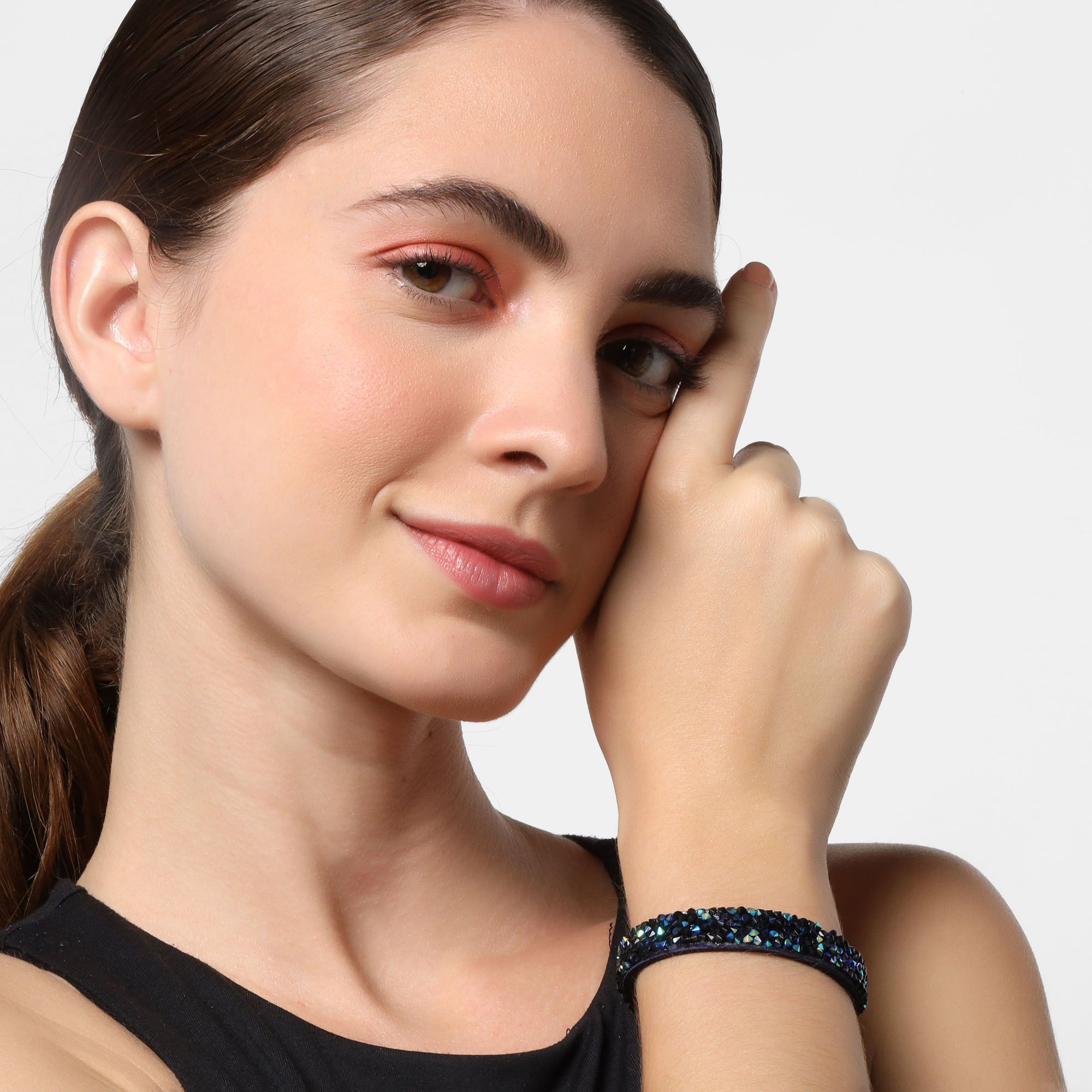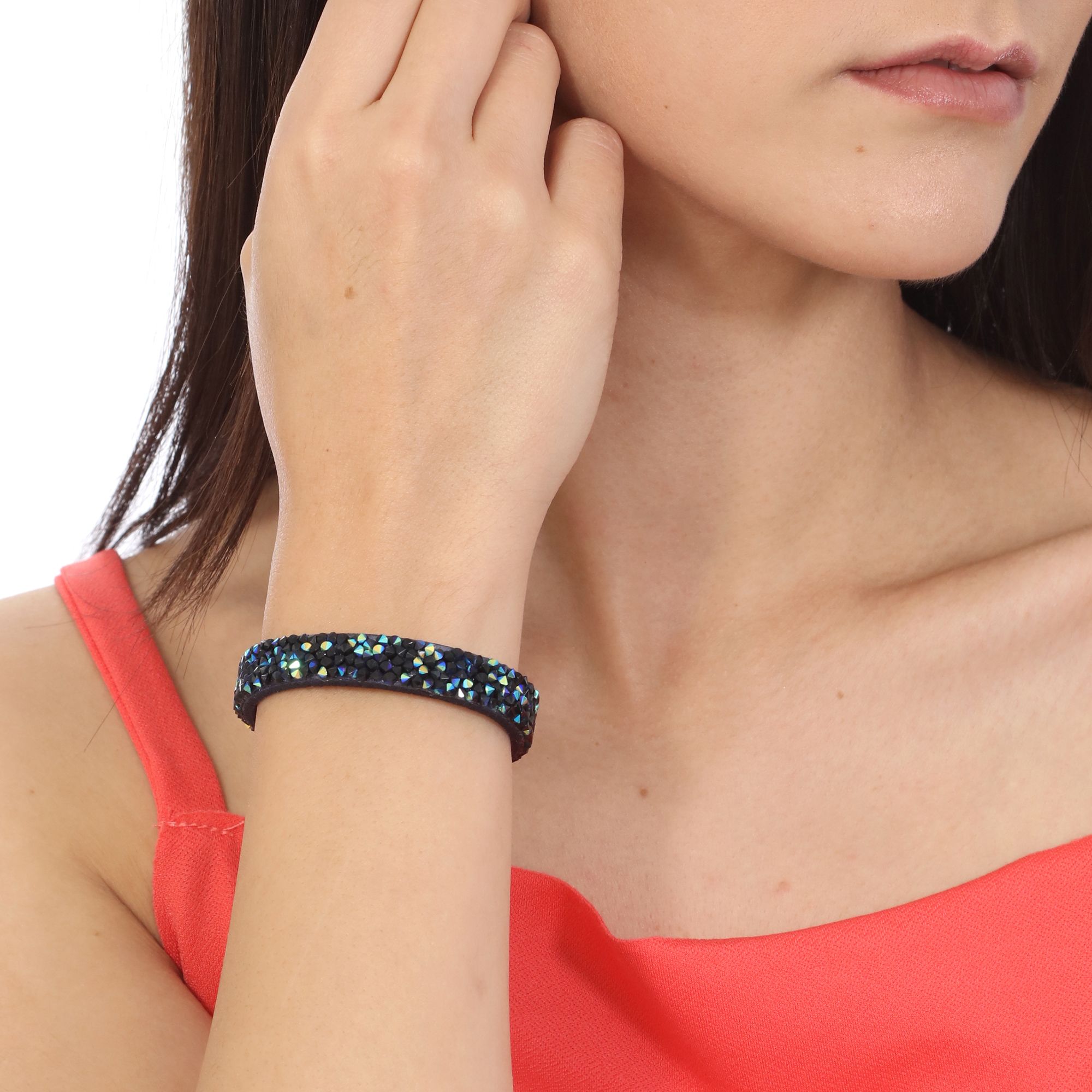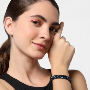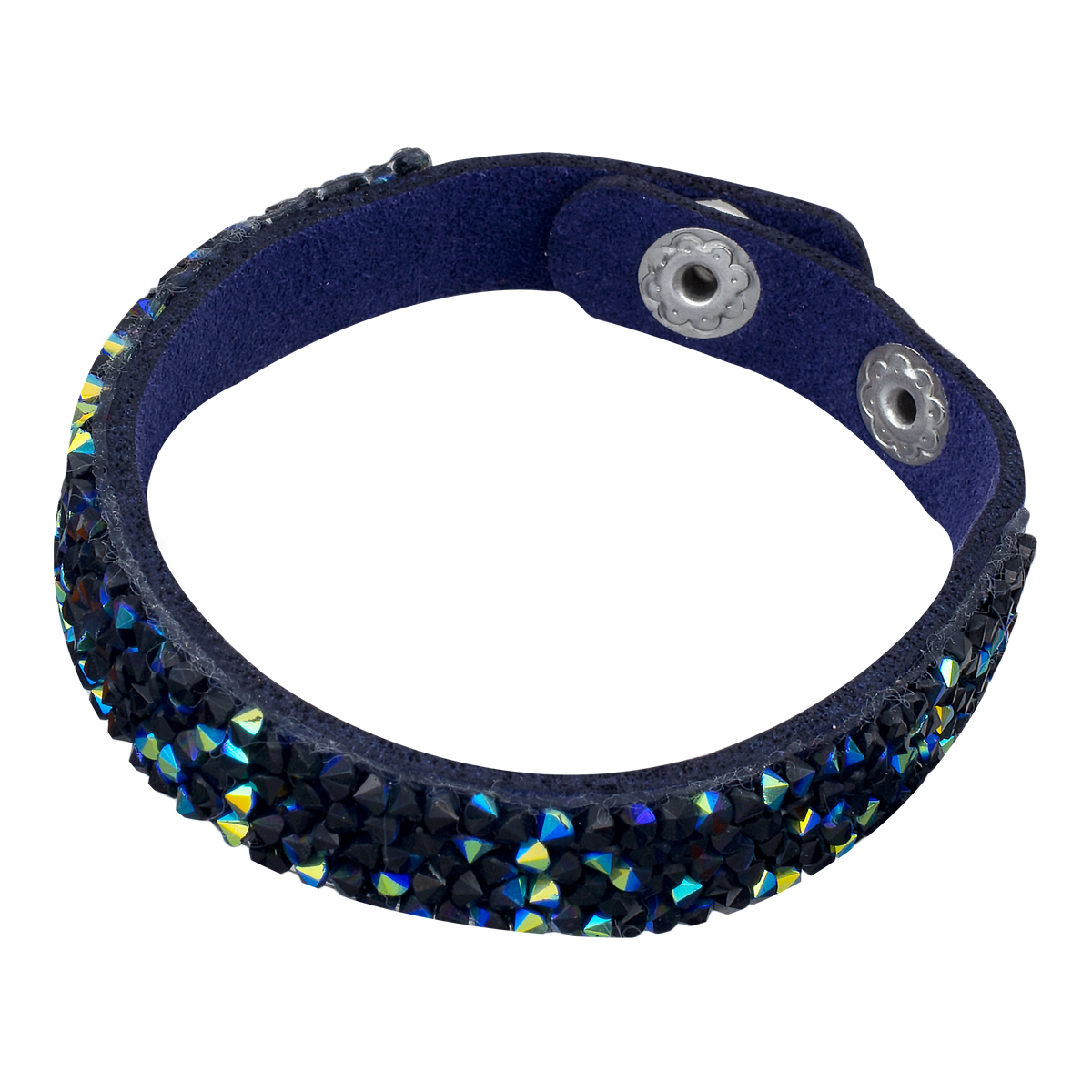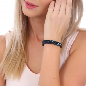 Pulsera en gamuza color azul, original diseño, con incrustaciones de cristales en color azul, negro y tornasol.