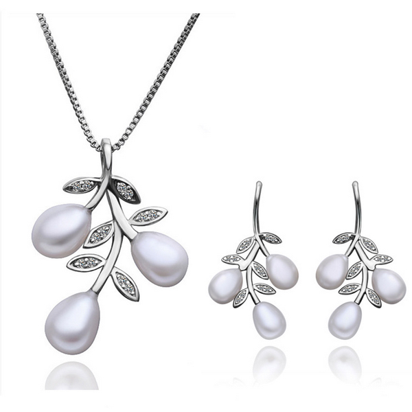 Juego de aretes y dije en baño de oro blanco de 18 quilates, diseño de hojas con detalles de perlas en las puntas. con incrustación de cristales en color blanco.