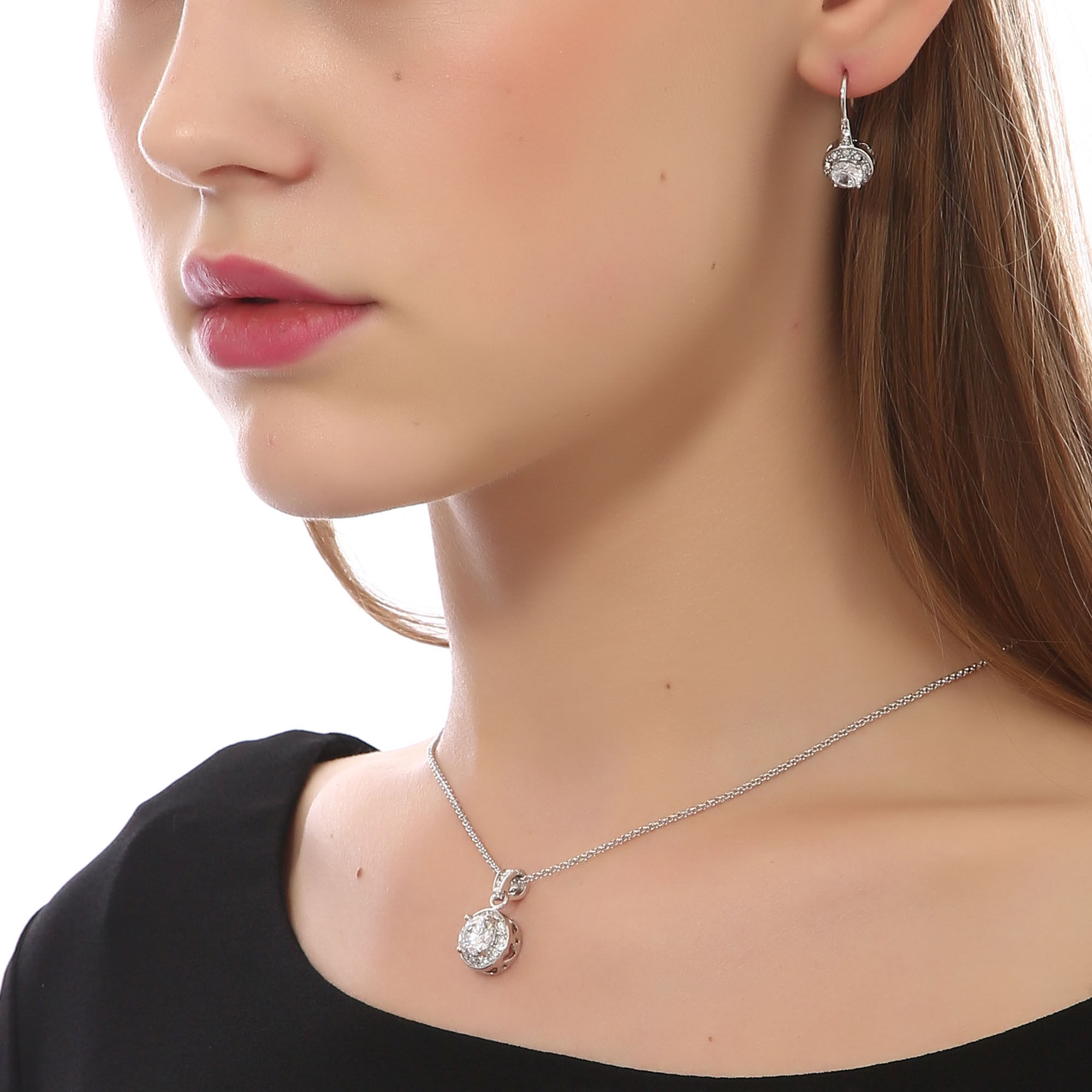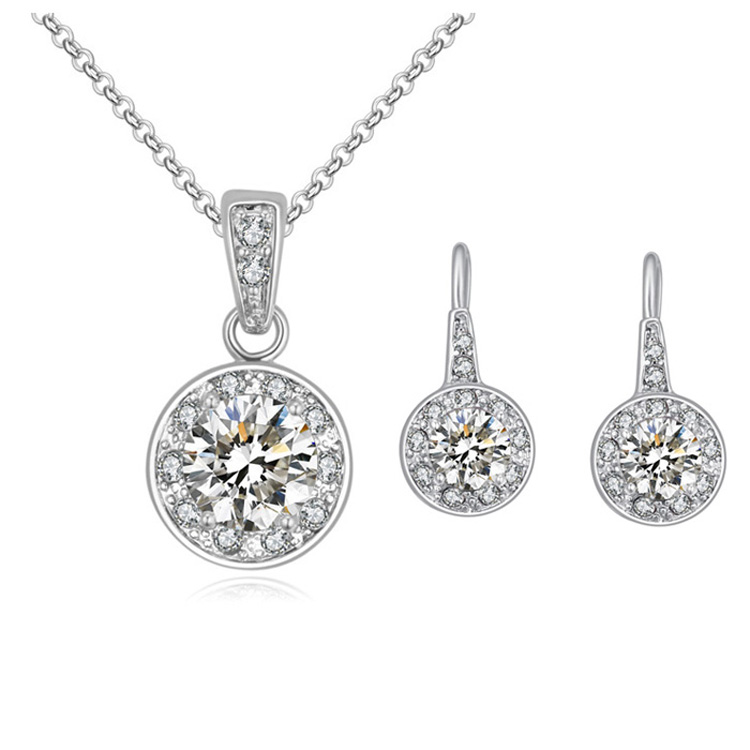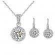 Juego de aretes y dije en baño de oro blanco de 18 quilates, diseño de círculo con incrustación de cristales en color blanco.