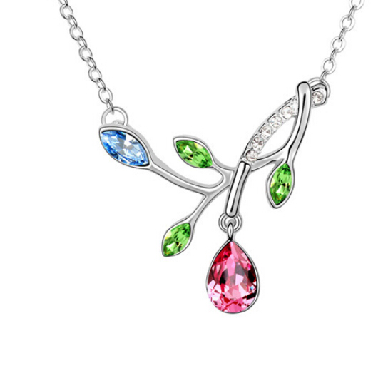 Dije en baño de oro blanco de 18 quilates, fino diseño de hojas con incrustación de cristales en color blanco y colores. Fabricado en una estructura de aleación de platino con rodio sin níquel 1. joyería Hipoalergénica. 2. Incluye cajita de joyería. 3. Garantía de 30 días por defectos de fabrica.