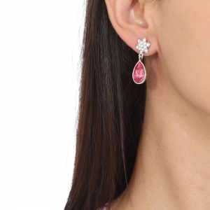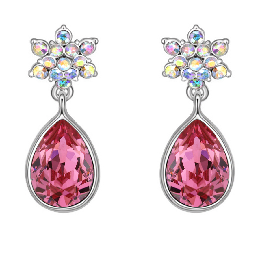 Aretes en baño de oro blanco de 18 quilates, diseño de gota y estrella con cristal rosa corte pera y cristales tornasol.