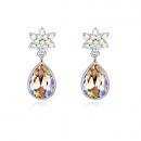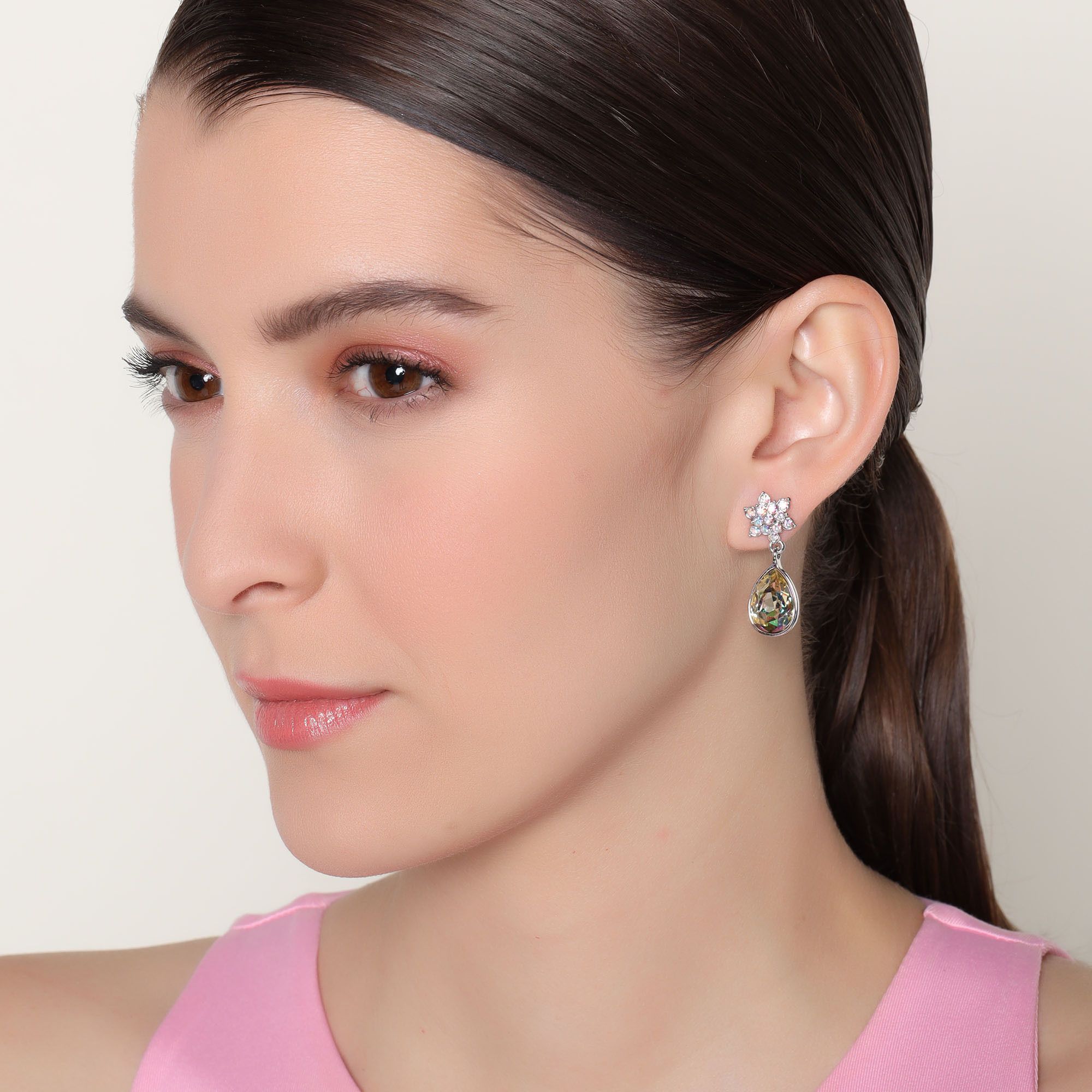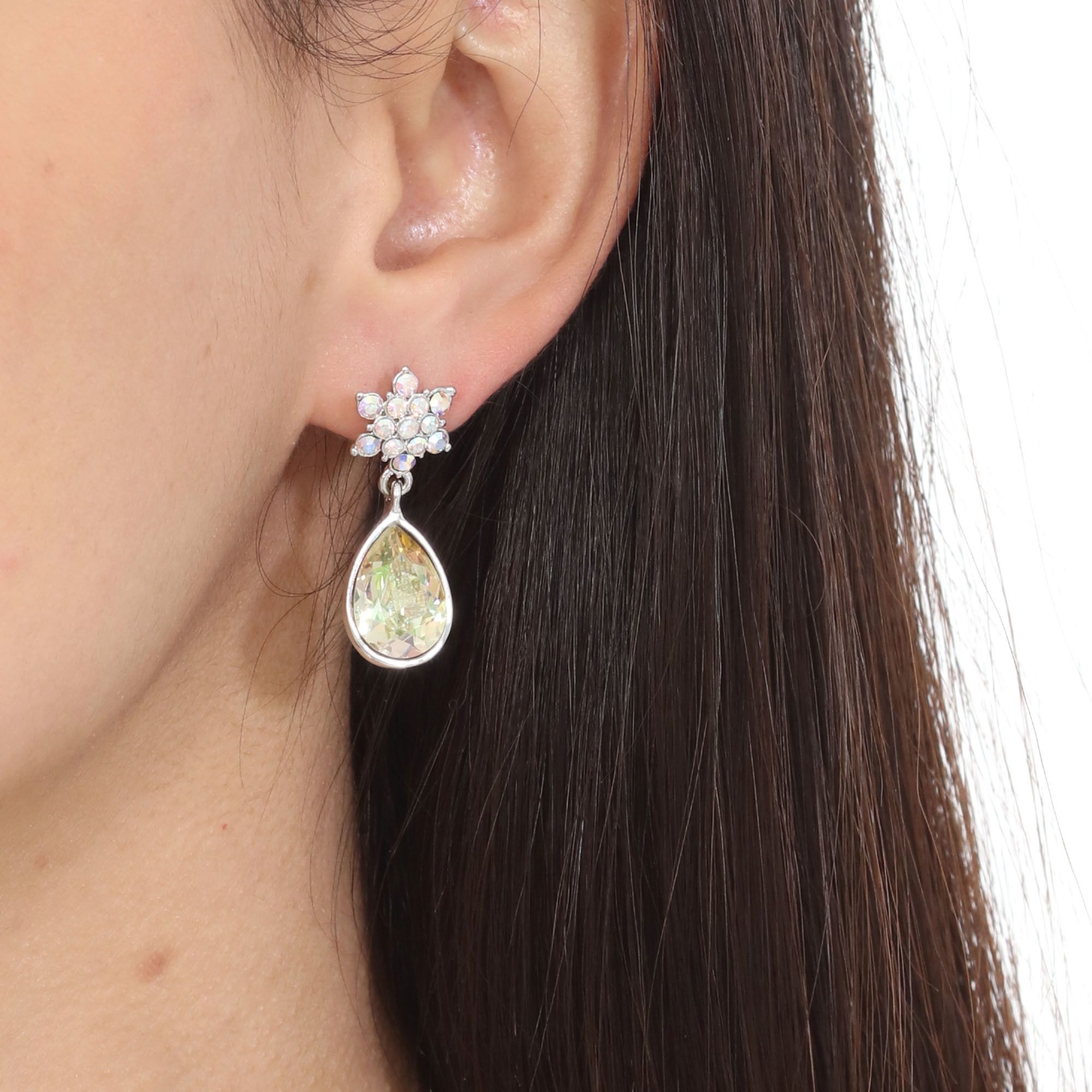 Aretes en baño de oro blanco de 18 quilates, diseño de gota y estrella con cristal tornasol corte pera y cristales tornasol.