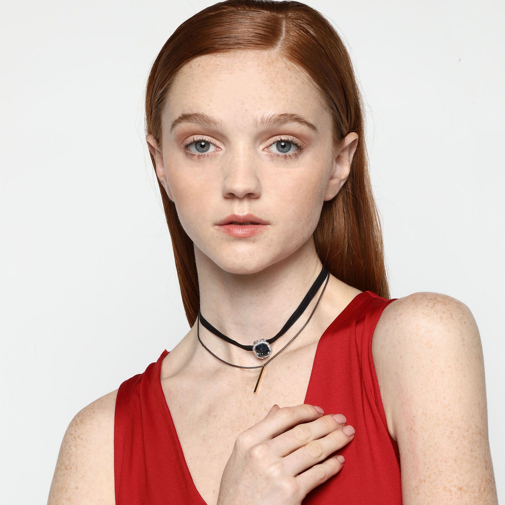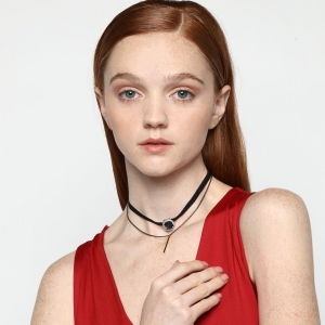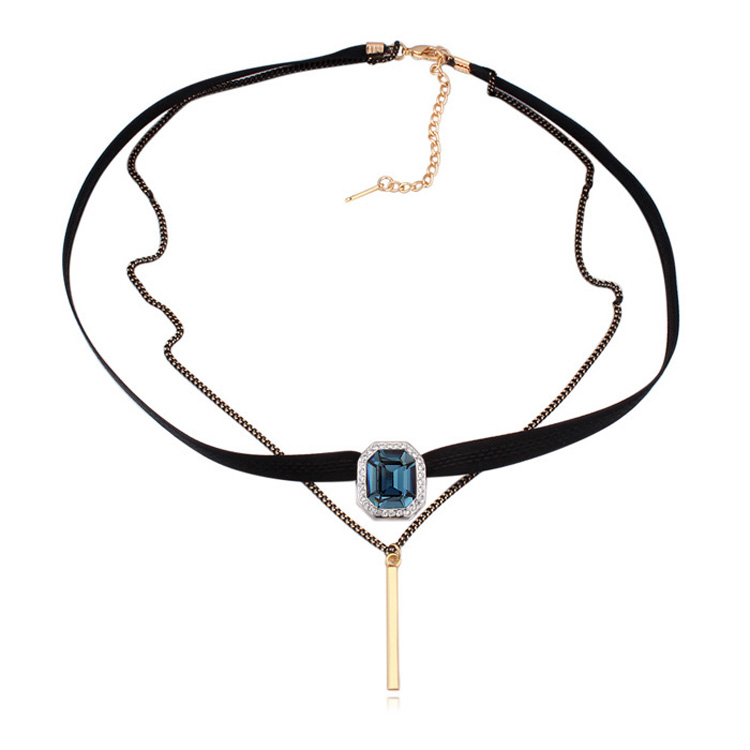 Gargantilla color negro, con detalles en baño de oro amarillo de 18 quilates, cristal azul corte esmeralda e incrustaciones de cristales blancos . Fabricado en una estructura de aleación de platino con rodio sin níquel 1. joyería Hipoalergénica. 2. Incluye cajita de joyería. 3. Garantía de 30 días por defectos de fabrica.