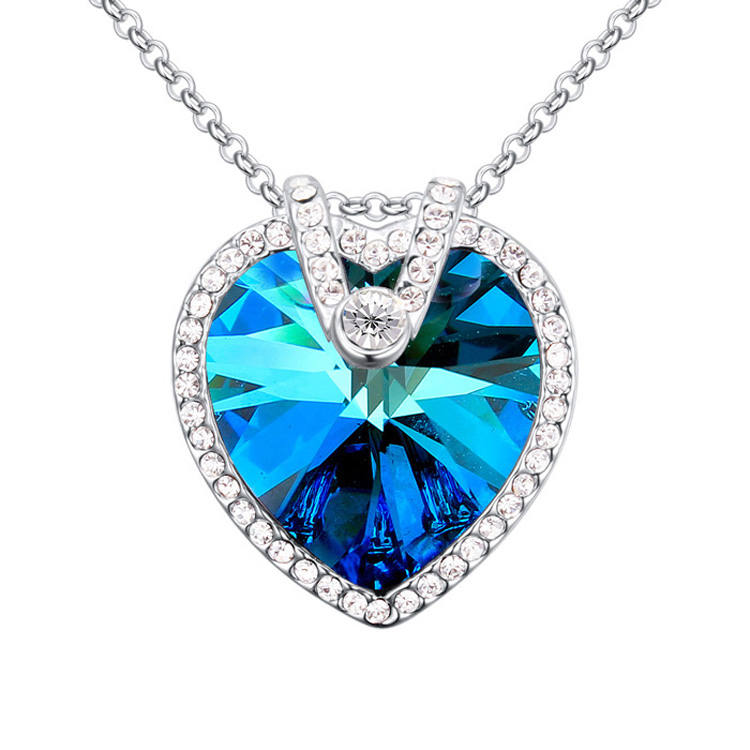 Dije con cadena en baño de oro blanco de 18 quilates, diseño de corazón con incrustación de cristales en color blanco y azul. Fabricado en una estructura de aleación de platino con rodio sin níquel 1. joyería Hipoalergénica. 2. Incluye cajita de joyería. 3. Garantía de 30 días por defectos de fabrica.