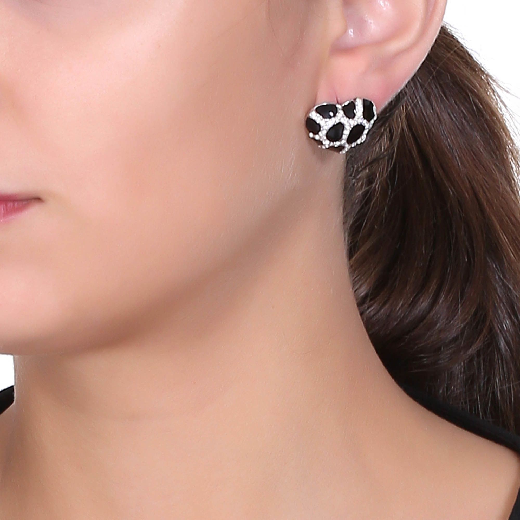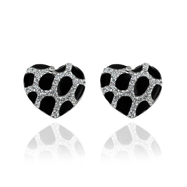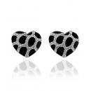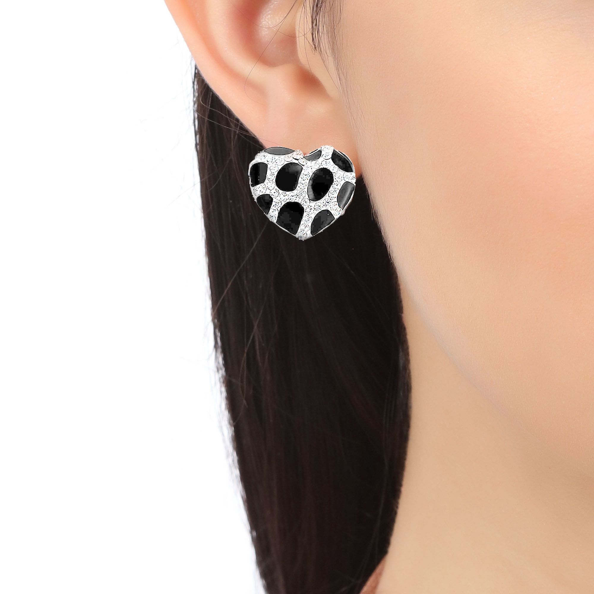Aretes en baño de oro blanco de 18 quilates, diseño de corazón, con detalles en esmaltado color negro e incrustación de cristales blancos.