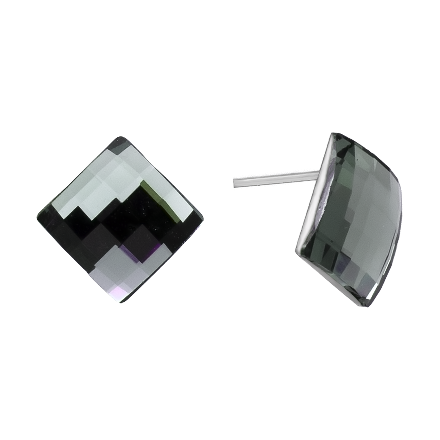 Elegantes aretes en baño de oro blanco de 18 quilates, diseño de rombo, con cristal color humo facetado en corte cushion.