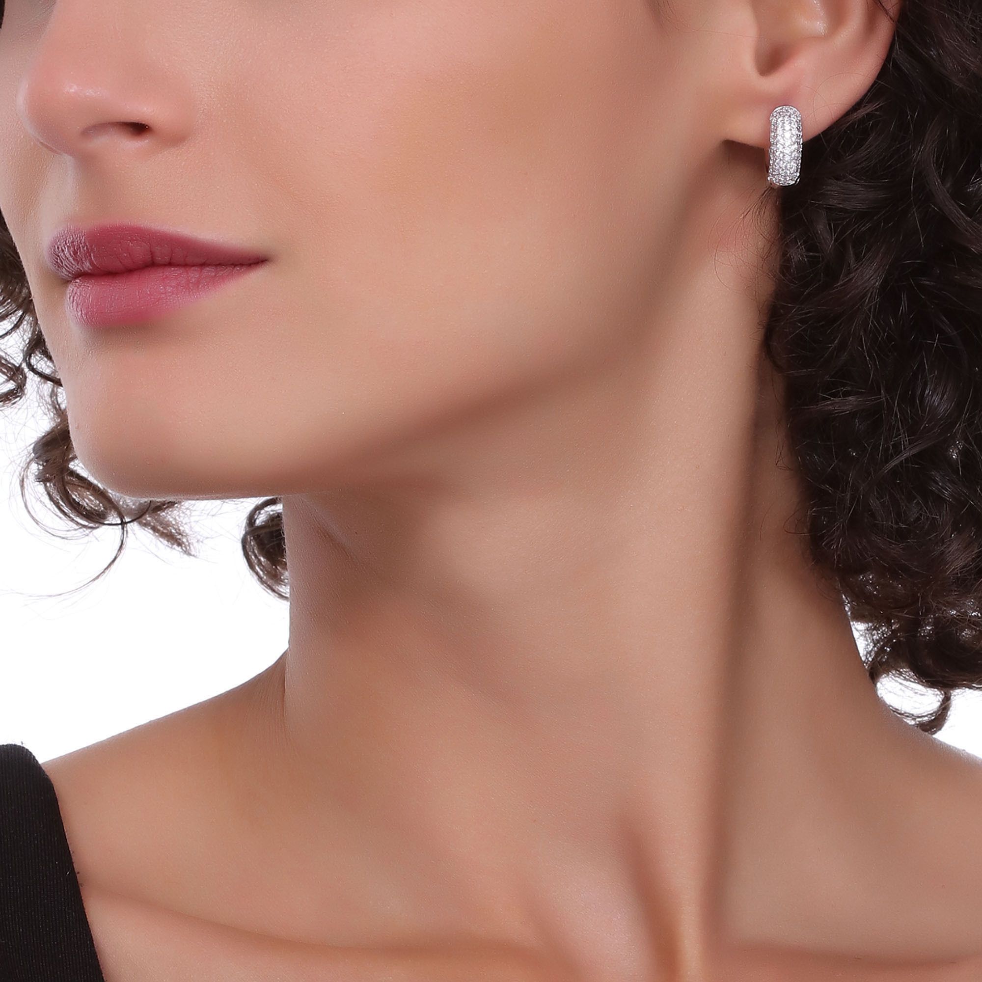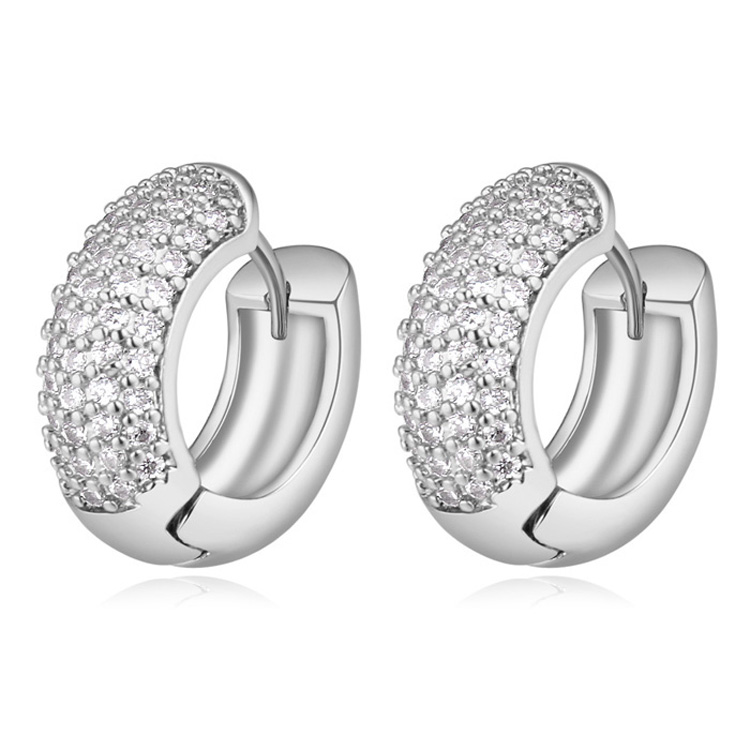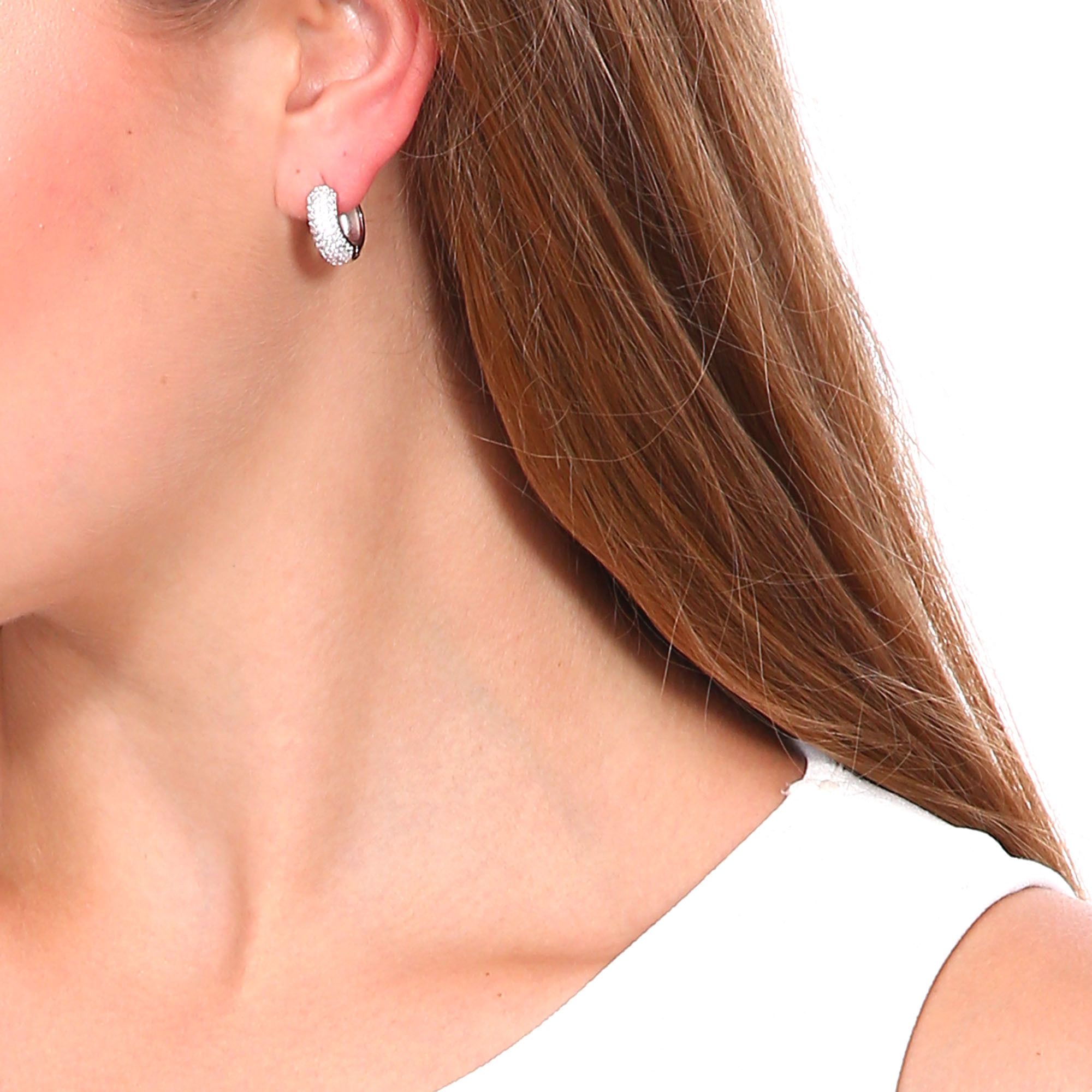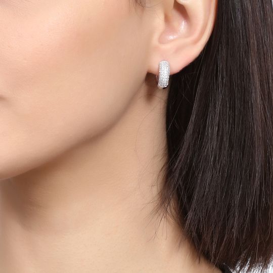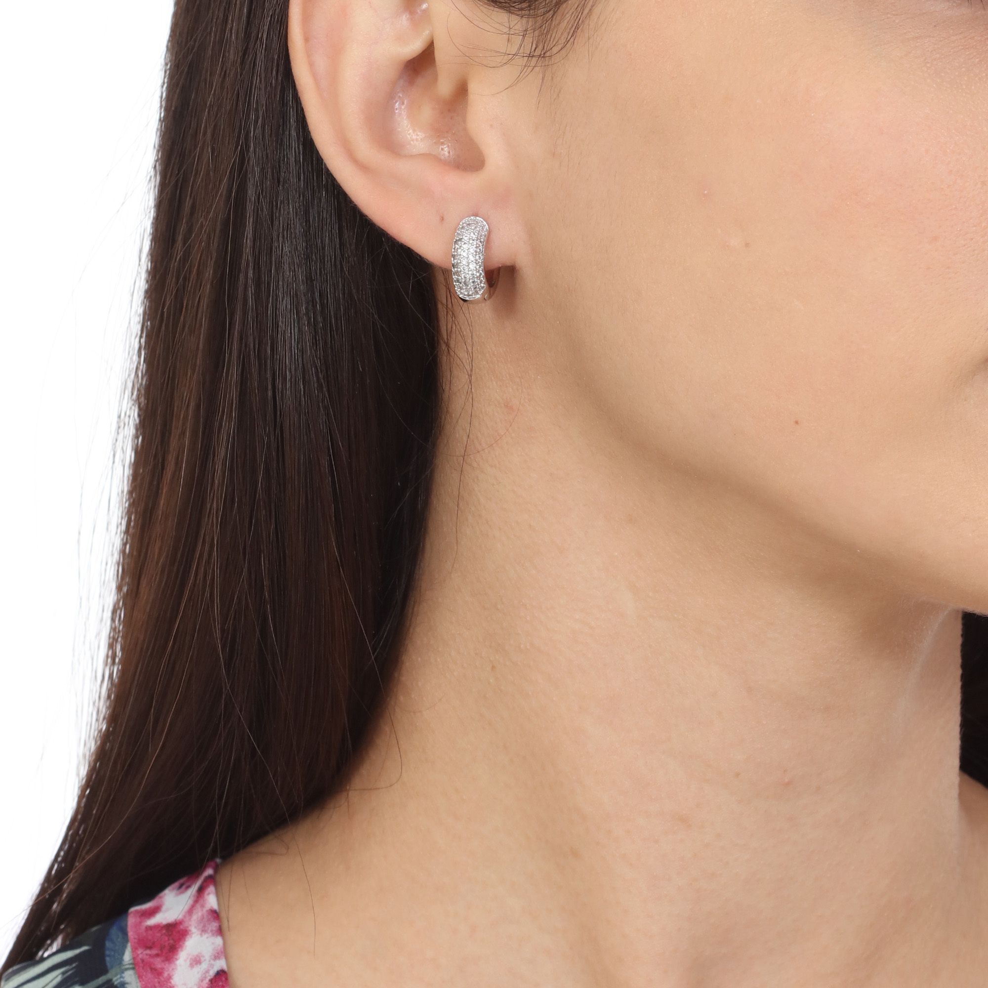 Preciosas arracadas, en baño de oro blanco de 18 quilates, elegante diseño, con incrustaciones de cristales en color blanco. Fabricado en una estructura de aleación de platino con rodio sin níquel.