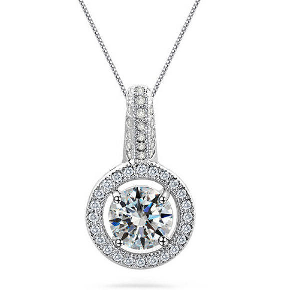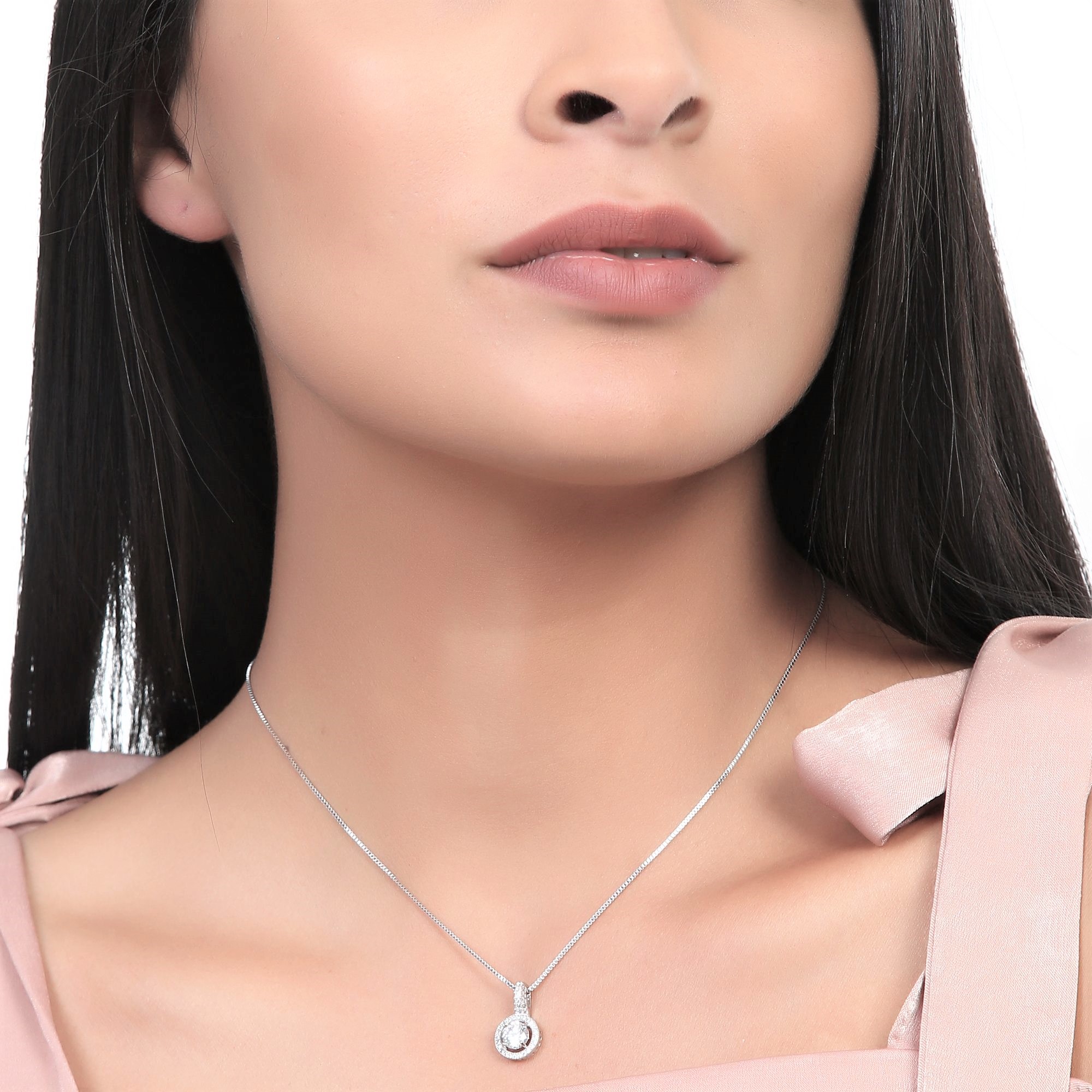Dije con cadena en baño de oro blanco de 18 quilates, fino diseño de círculo con incrustación de cristales en color blanco.