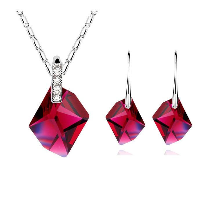 Juego de aretes y dije en baño de oro blanco de 18 quilates, con incrustación de cristales en color fiusha.