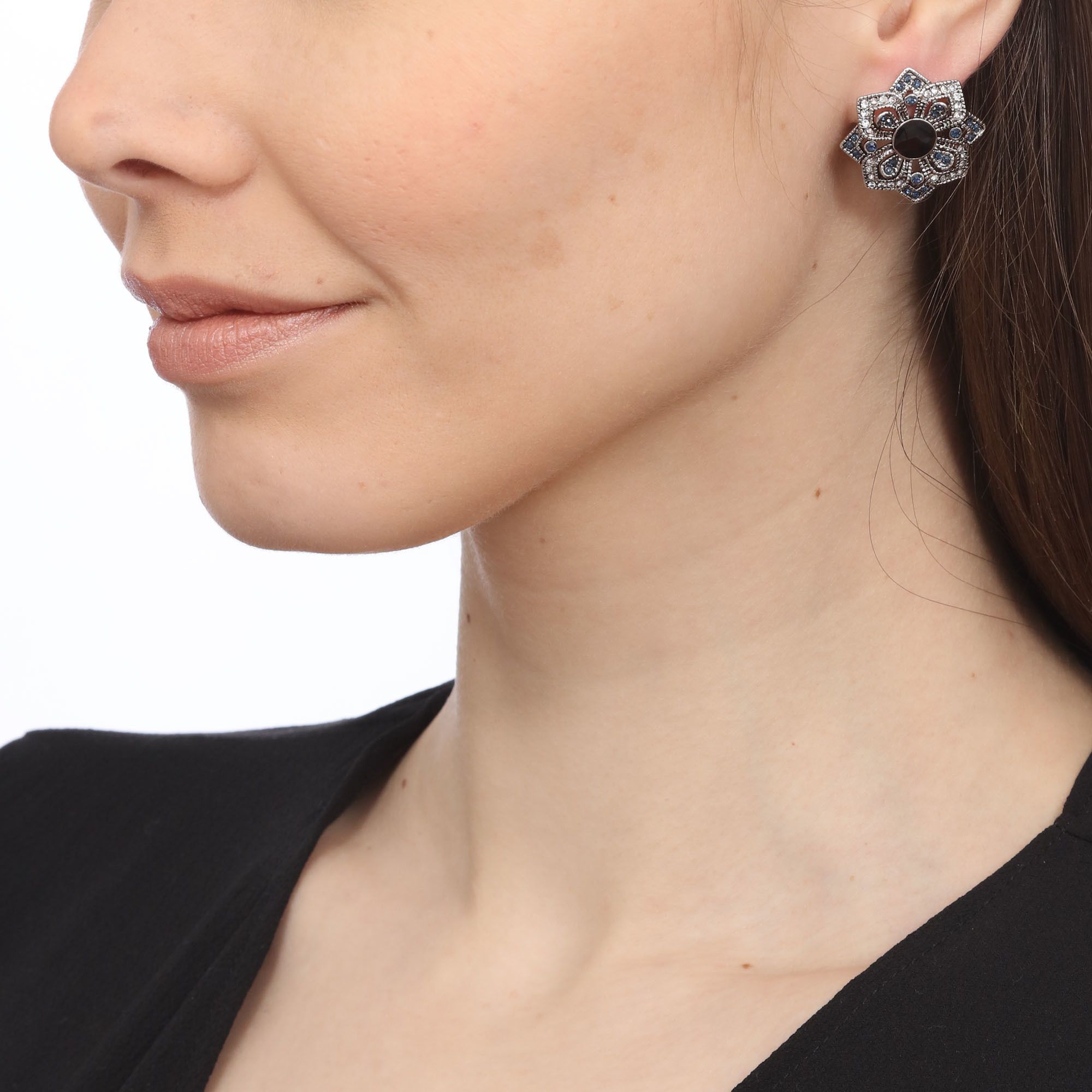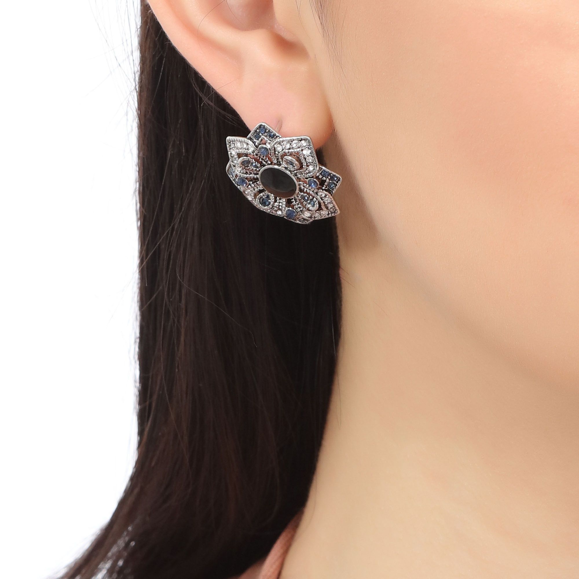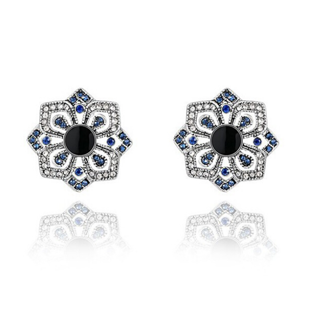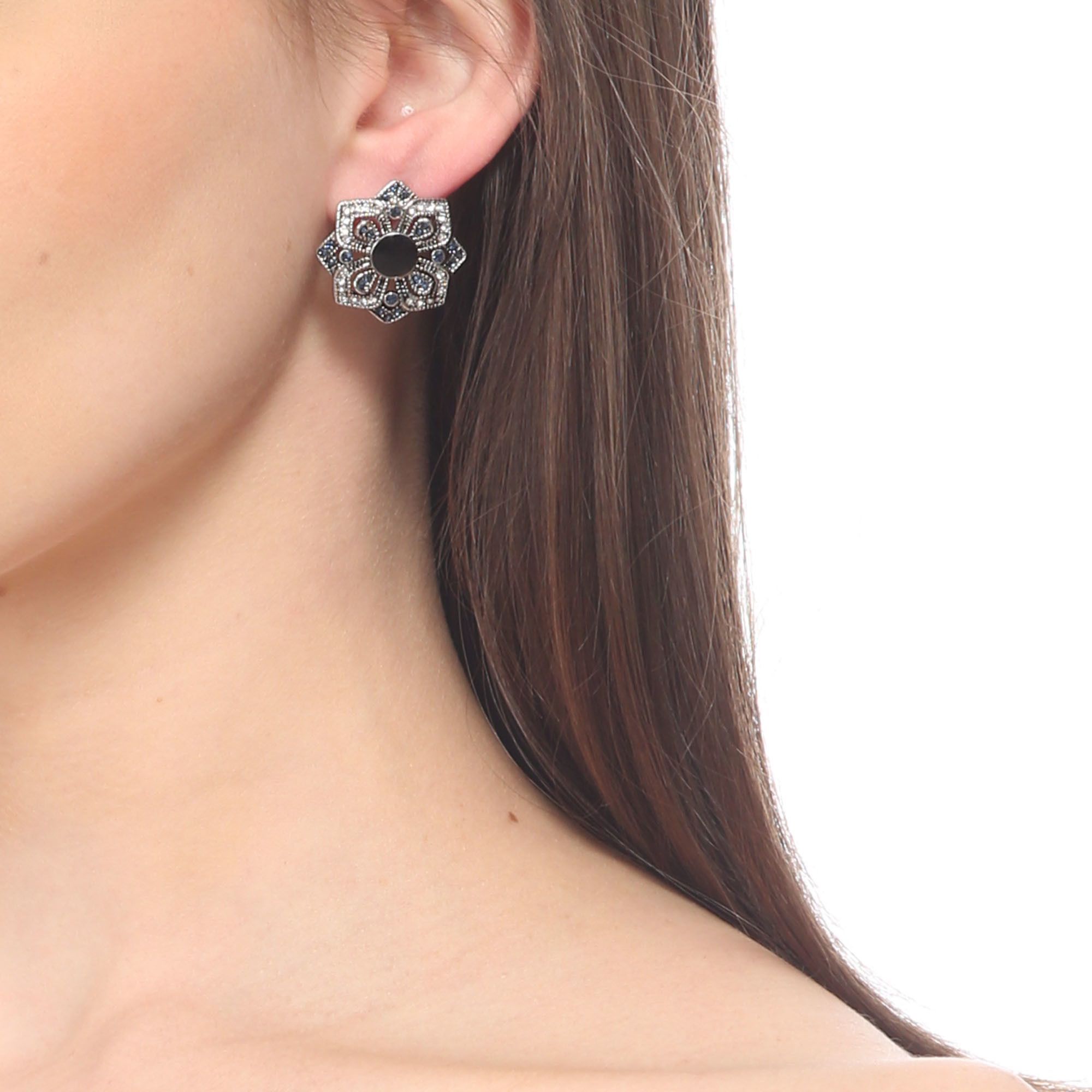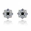 Aretes, en baño de oro blanco de 18 quilates, diseño de flor, con cristal color negro corte circular, e incrustaciones de cristales blanco y azul.