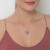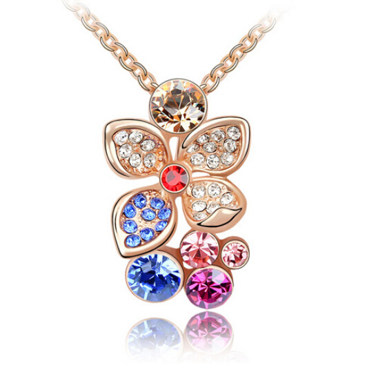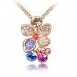 Dije con cadena en baño de oro rosa de 18 quilates, diseño de orquídea con cristales corte brillante en color ámbar, rosa, fiusha, azul y rojo e incrustación de cristales en color blanco y azul.
