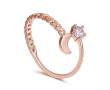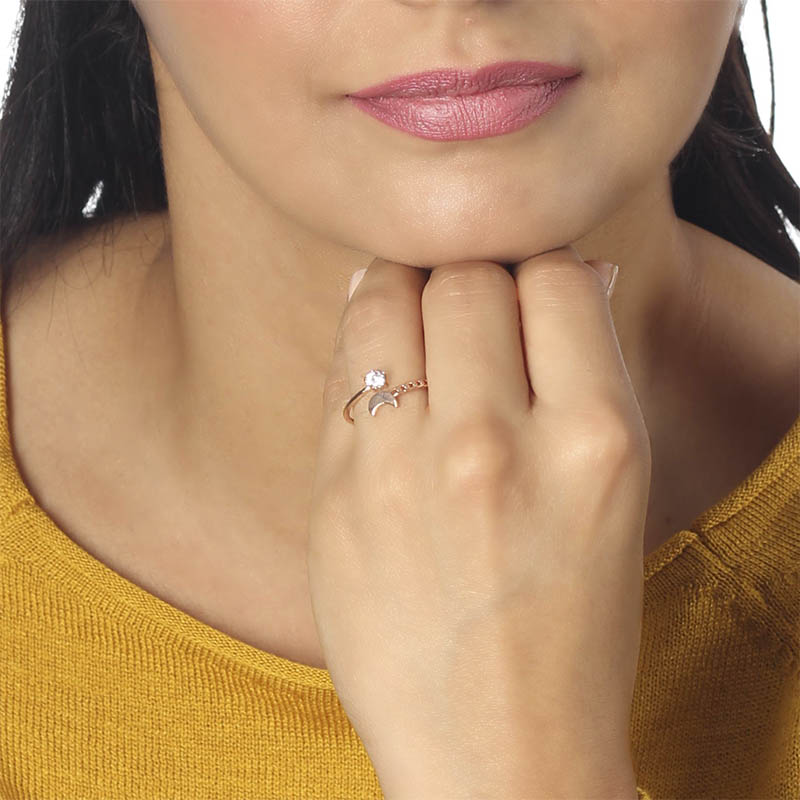 Delicado anillo ajustable, en baño de oro rosa de 18 quilates, diseño de luna, con cristal blanco corte brillante y detalle trenzado en relieve.